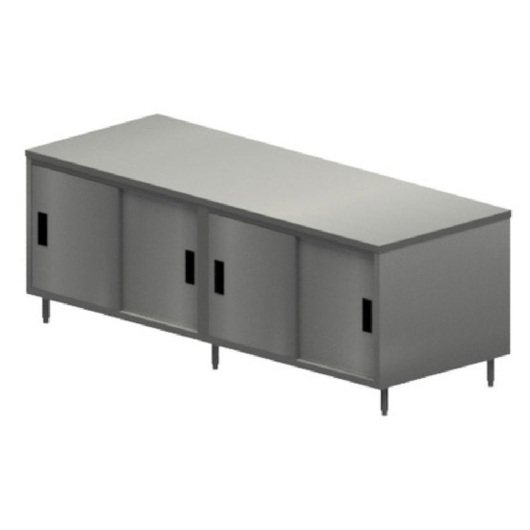 The BK Resources CST-3696S Chef Table Cabinet Base With Sliding Doors is a meticulously engineered workspace solution for professional kitchens, boasting an overall size of 96"W x 36"D x 34-3/4"H. It features a premium 14/304 stainless steel top, ensuring durability and resistance to corrosion, ideal for rigorous commercial use. The cabinet body is constructed from 18/304 stainless steel, offering a robust structure for long-term operational efficiency. Designed with a center mullion, this chef table includes two sets of sliding doors that maximize accessibility and streamline workflow. The inclusion of 6" stainless steel legs with a 1" height adjustment capability provides adaptability to various kitchen environments, accommodating users' ergonomic needs. The NSF certification of this unit underscores its compliance with essential public health standards, ensuring a hygienic environment for food preparation. With a lead time of 3-10 days, this chef table meets the demands of culinary professionals seeking a reliable and adaptable kitchen asset. Its thoughtful design caters to diverse market segments within the food service industry, offering a balance of form, function, and compliance, making it an invaluable tool in enhancing kitchen efficiency and productivity.
