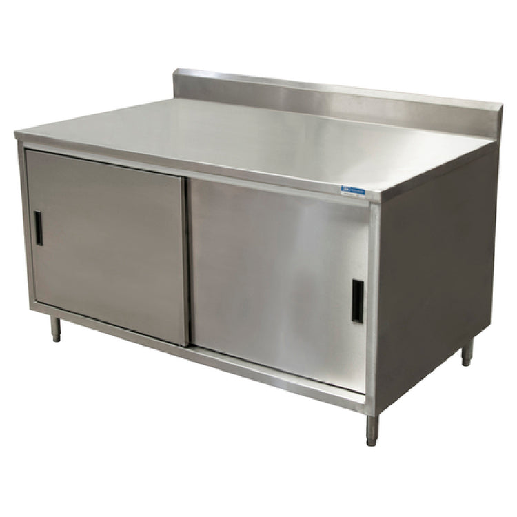 The BK Resources CSTR5-3036S Chef Table Cabinet Base With Sliding Doors is a meticulously crafted piece of kitchen equipment designed to enhance the efficiency of any culinary environment. Measuring 36 inches in width, 30 inches in depth, and standing at a height of 39-3/4 inches overall, this chef table is built to accommodate a variety of kitchen setups. The top is constructed from 14-gauge, 304 stainless steel, known for its durability and resistance to corrosion, making it ideal for high-traffic kitchens. The cabinet body is made from 18-gauge, 304 stainless steel, providing a sturdy and reliable structure for everyday use. A functional set of sliding doors ensures easy access to stored items, enhancing operational efficiency. The table includes a 5-inch back riser for added practicality, preventing utensils or ingredients from falling off the back. Supported by 6-inch stainless steel legs, each with a 1-inch height adjustment capability, the table offers stability and adaptability on uneven floors. Stainless steel feet contribute to its robust construction. NSF certification attests to its compliance with stringent health and safety standards. Designed with versatility in mind, this chef table is suited for professional kitchens, offering a blend of durability, accessibility, and hygienic design.