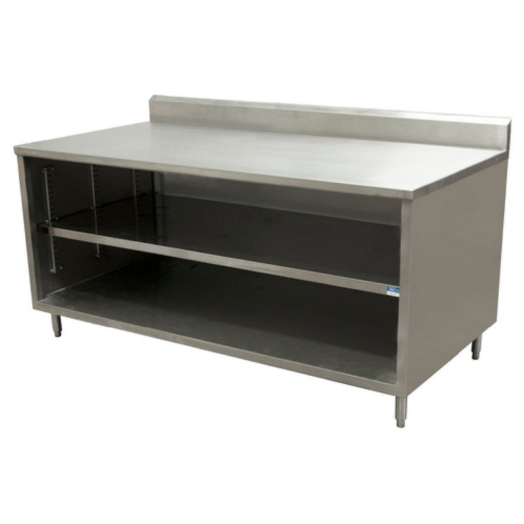 The BK Resources CSTR5-3072 Chef Table Cabinet Base With Open Front is a versatile and robust addition to any professional kitchen, catering to the diverse needs of culinary experts across various segments of the foodservice industry. This chef table features an overall size of 72"W x 30"D x 39-3/4"H, providing ample workspace and storage utility. The top is crafted from 14/304 stainless steel, ensuring durability and ease of maintenance, while a 5" back riser helps contain spills and splatters. The body of the table is constructed from 18/304 stainless steel, offering additional strength and resistance to corrosion. Supported by 6" stainless steel legs with a 1" height adjustment feature, this table ensures stability and adaptability to different workspace requirements. The stainless steel feet enhance the unit's sturdiness and prolong its lifespan. Designed with an open front, it facilitates easy access to stored items, optimizing workflow efficiency. The BK Resources CSTR5-3072 Chef Table is NSF certified, affirming its compliance with public health and safety standards, making it an ideal choice for restaurants, catering services, and institutional kitchens seeking reliable and high-quality kitchen equipment.