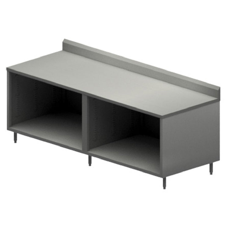The BK Resources CSTR5-3096 Chef Table Cabinet Base With Open Front is a specialized piece of equipment designed for professional kitchen environments demanding durability and utility. Measuring 96 inches in width, 30 inches in depth, and 39-3/4 inches in height overall, it provides ample workspace. The countertop is constructed from 14-gauge, 304 stainless steel, renowned for its resistance to corrosion and ease of cleaning, while the 5-inch back riser helps prevent spillage and adds to the cleanliness of the workspace. Its body, made of 18-gauge, 304 stainless steel, ensures a robust and long-lasting structure. This chef table is equipped with a center mullion, offering additional support and stability. It stands on 6-inch stainless steel legs, providing a 1-inch height adjustment to accommodate various ergonomic needs. Stainless steel feet contribute to its sturdy stance, ensuring reliability under heavy use. Recognized by the NSF, this product meets high standards for public health protection, making it suitable for use in diverse culinary settings such as restaurants, catering services, and institutional kitchens. The combination of its open front design and high-grade materials makes the BK Resources CSTR5-3096 an invaluable asset to any professional kitchen, blending functionality with industrial-grade quality.