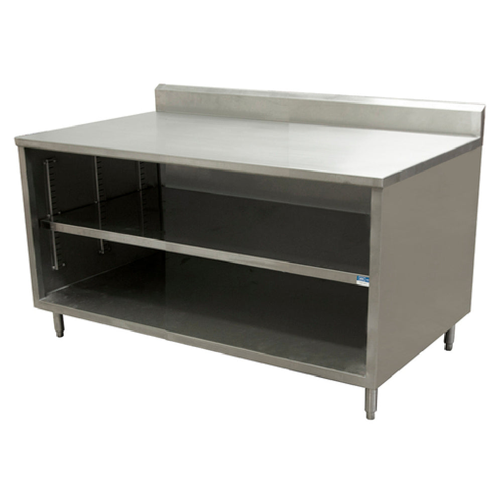 The BK Resources CSTR5-3648 Chef Table Cabinet Base With Open Front is a versatile and durable piece of equipment designed for professional kitchens, offering a 48-inch width, 36-inch depth, and 39-3/4-inch height overall size. The table features a 14-gauge, 304 stainless steel top with a 5-inch back riser, ensuring durability and ease of maintenance in high-demand environments. Its 18-gauge, 304 stainless steel body enhances structural integrity, making it an ideal choice for busy culinary settings. The chef table is supported by 6-inch stainless steel legs, which include a 1-inch height adjustment option, allowing for customization based on specific workspace requirements. Stainless steel feet further enhance stability, ensuring the table remains securely in place during use. The open front design provides easy access to stored items, optimizing workflow and efficiency in bustling kitchens. Certified by NSF, this chef table meets the rigorous public health and safety standards, making it suitable for various food service applications. The BK Resources CSTR5-3648 Chef Table Cabinet Base is a reliable and practical addition to any commercial kitchen, combining robust construction with functional design to support the diverse needs of the food service industry.