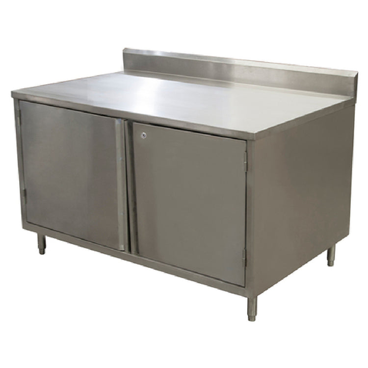The BK Resources CSTR5-3648HL Work Table Cabinet Base With Hinged Doors & Locks is a versatile and durable piece of equipment, ideal for a range of professional settings. This unit measures an overall size of 48" wide, 36" deep, and 39-3/4" high, offering ample workspace and storage. The top of the work table is constructed from 14/304 stainless steel, ensuring durability and resistance to corrosion, with a 5" back riser to prevent items from slipping off the back. The body of the cabinet is made from 18/304 stainless steel, providing a robust and long-lasting structure. It includes a set of hinged doors equipped with locks for secure storage of tools or materials. Supported by 6" stainless steel adjustable legs, this work table can be customized to the desired height for optimal comfort and utility during use. Additionally, the product is NSF certified, highlighting its compliance with stringent public health standards. This work table is particularly beneficial for industries requiring reliable storage and workspace solutions, such as food service, laboratories, or industrial environments where hygiene and durability are paramount. With a lead time of 3-10 days, it offers timely integration into your workflow.
