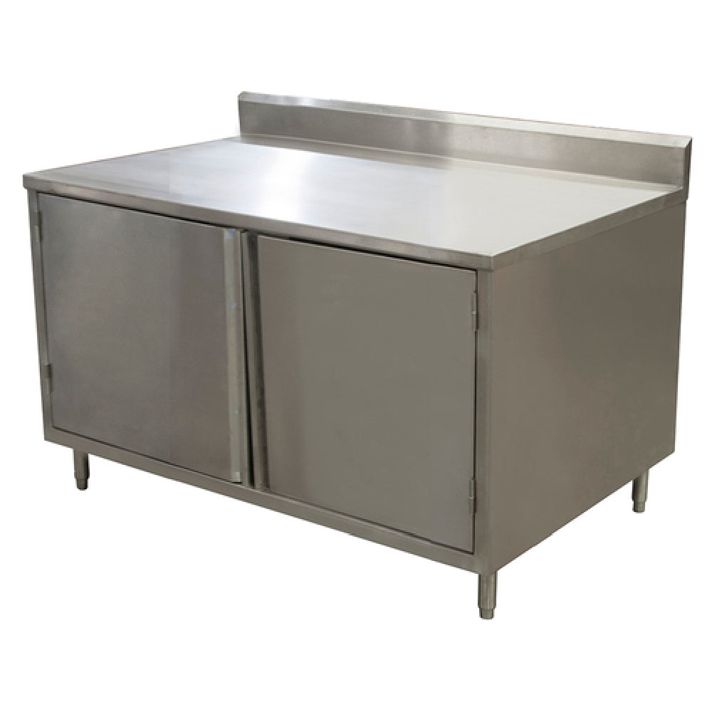 The BK Resources CSTR5-3660H Work Table Cabinet Base With Hinged Doors is a versatile and robust addition to any commercial kitchen, measuring 60 inches in width, 36 inches in depth, and 39-3/4 inches in overall height. This work table combines practicality with durability, featuring a 14-gauge 304 stainless steel top that is equipped with a 5-inch back riser to protect walls from splashes and spills. The body of the cabinet is constructed from 18-gauge 304 stainless steel, ensuring long-lasting performance and resistance to corrosion. The unit is designed with a set of hinged doors, providing easy access to the storage space within the cabinet base. For enhanced stability and adaptability on uneven surfaces, the work table is supported by 6-inch stainless steel adjustable legs. Endorsed by the NSF, this product meets rigorous public health standards, making it an ideal choice for restaurants, catering services, and food processing facilities looking to maintain high standards of hygiene and efficiency. With a lead time of 3 to 10 days, the BK Resources CSTR5-3660H is a reliable and efficient solution tailored to meet the demanding needs of the food service industry.