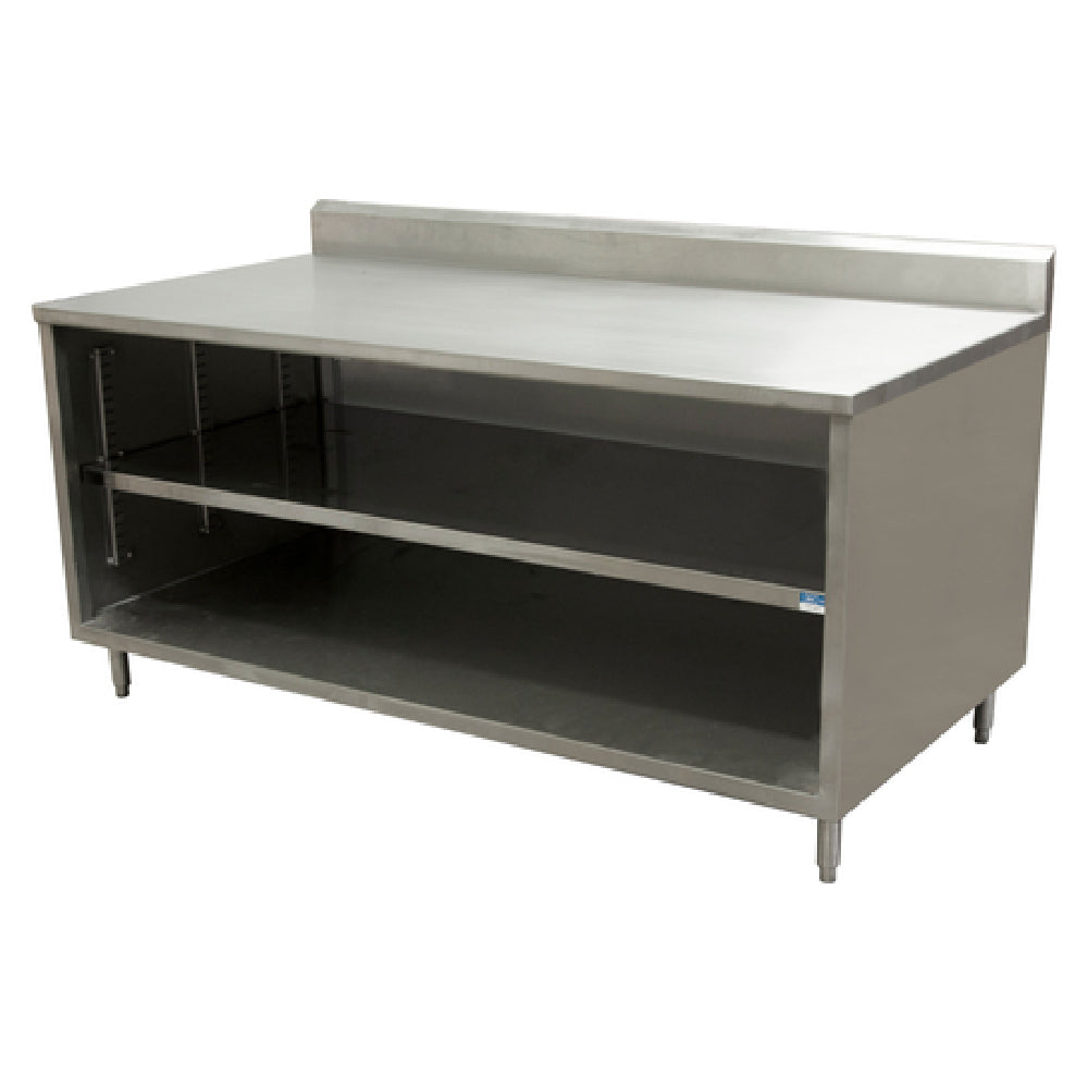 BK Resources CSTR5-3672 Chef Table Cabinet Base With Open Front 72"W X 36"D X 39-3/4"H Overall Size is a meticulously crafted unit designed to meet the demanding needs of professional kitchens. This chef table features a 14-gauge 304 stainless steel top with a 5" high back riser, offering durability and resistance to corrosion, which is essential for maintaining sanitary conditions in culinary environments. The body of the cabinet is made from 18-gauge 304 stainless steel, providing a sturdy and reliable structure suitable for heavy use. The open front design of the cabinet allows for easy access and organization of essential kitchen tools and ingredients, enhancing workflow efficiency. It stands on 6" stainless steel legs that feature a 1" height adjustment, ensuring stability on uneven surfaces and allowing customization to fit specific ergonomic needs. Additionally, the stainless steel feet contribute to the unit's robust support. This chef table is NSF certified, demonstrating its compliance with rigorous health and safety standards, making it an ideal choice for commercial kitchens in restaurants, hotels, and catering services. The BK Resources CSTR5-3672 is a perfect blend of functionality and resilience, tailored to withstand the rigorous demands of high-volume food preparation environments.