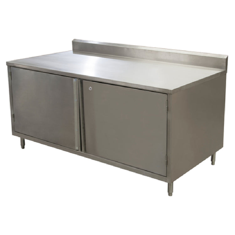 The BK Resources CSTR5-3672HL Work Table Cabinet Base With Hinged Doors & Locks is engineered for those seeking a combination of durability and security in their professional workspace. Measuring an expansive 72 inches in width, 36 inches in depth, and 39-3/4 inches in overall height, this work table is a robust solution for various industrial applications. The top is crafted from 14-gauge, 304 stainless steel and includes a 5-inch back riser, ensuring a resilient work surface that withstands heavy use and prevents material spillage. The body is constructed from 18-gauge, 304 stainless steel, providing strength and longevity. The cabinet base features a set of hinged doors with locking mechanisms, enhancing security for stored items. For stability on uneven surfaces, it is equipped with 6-inch stainless steel adjustable legs. Certified by NSF, this work table adheres to strict public health and safety standards, making it suitable for use in food service, laboratory, and industrial environments. With a lead time of 3 to 10 days, the BK Resources CSTR5-3672HL embodies a perfect blend of functionality, security, and compliance, meeting the needs of professionals in diverse sectors.