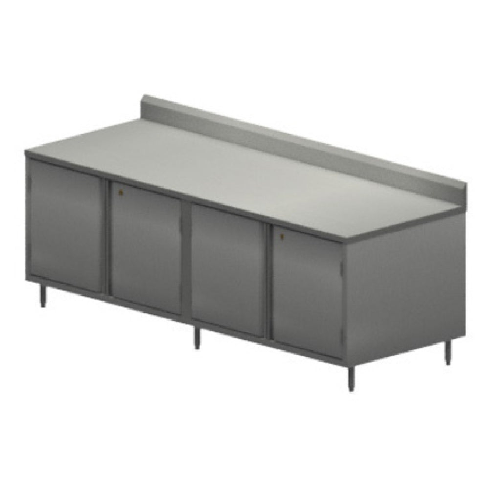 The BK Resources CSTR5-3696HL Chef Table Cabinet Base with Hinged Doors & Locks is a meticulously designed unit tailored for culinary professionals who demand both functionality and style. Measuring an expansive 96 inches in width, 36 inches in depth, and 39-3/4 inches in height, this chef table is a versatile addition to any kitchen environment. The top is crafted from 14/304 stainless steel and features a 5-inch back riser, offering exceptional durability and resistance to corrosion, making it ideal for withstanding rigorous kitchen operations. The body is constructed from sturdy 18/304 stainless steel, ensuring a robust structure that supports daily use. The table is equipped with a center mullion and two sets of hinged doors, each with locks, providing secure storage solutions for culinary equipment and supplies. With 6-inch stainless steel legs featuring a 1-inch height adjustment and stainless steel feet, this unit offers stability and adaptability to various kitchen settings. NSF certification ensures compliance with health and safety standards, underscoring its suitability for professional use. The BK Resources CSTR5-3696HL is designed to meet the diverse needs of the food service industry, from bustling restaurant kitchens to catering operations, delivering both practicality and aesthetic appeal.