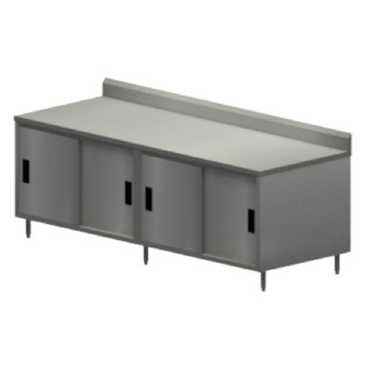 The BK Resources CSTR5-3696S Chef Table Cabinet Base With Sliding Doors is a meticulously designed unit tailored for the demanding environment of professional kitchens. Featuring an expansive size of 96"W x 36"D x 39-3/4"H, this chef table offers ample workspace and storage. Its top is crafted from 14-gauge, 304 stainless steel, paired with a 5" back riser to prevent any spills. The body utilizes 18-gauge, 304 stainless steel, ensuring durability and resistance to corrosion. Central to its design is a center mullion, which provides structural support, and two sets of sliding doors that facilitate easy access to stored items. The table stands on 6" stainless steel legs with a 1" height adjustment feature, allowing for stability on uneven surfaces, while stainless steel feet contribute to its robust foundation. Each element of this chef table is designed not only for functionality but also to meet NSF standards, emphasizing its adherence to public health safety guidelines. The BK Resources CSTR5-3696S is an essential fixture for diverse culinary environments, from bustling restaurant kitchens to expansive catering facilities, where durability, efficiency, and compliance with health standards are paramount.