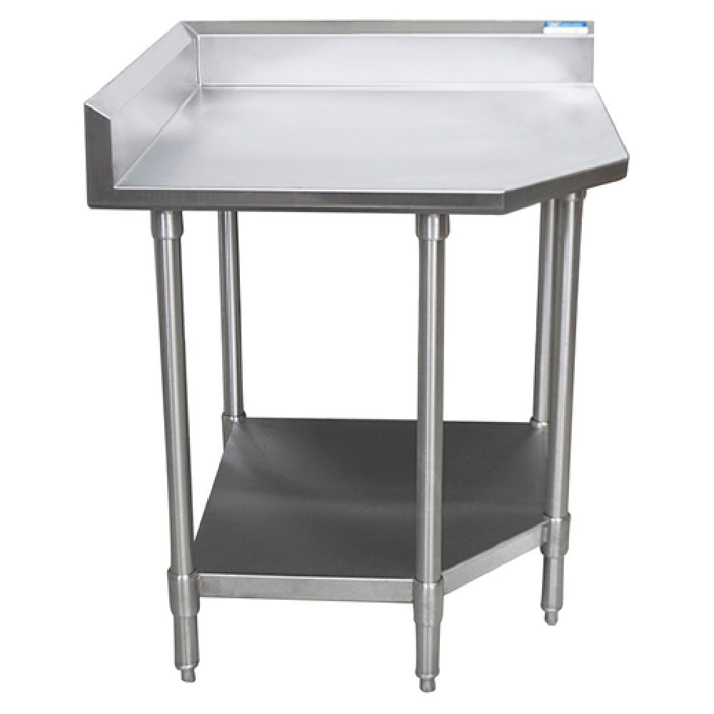 The BK Resources CVTCR5-3030 Corner Work Table is a compact and efficient solution for maximizing workspace in industrial kitchens, laboratories, and commercial environments. With a 30"W x 30"D surface, this table is designed to fit seamlessly into corner spaces, optimizing utility without sacrificing room. The inclusion of a 5"H riser on two sides provides added protection and helps maintain cleanliness by preventing items from falling off the table. Constructed with a 16-gauge, 304-grade stainless steel top, it promises durability and resistance to corrosion, making it suitable for heavy-duty use. Reinforced by two 2-inch rectangular steel tubes, the table guarantees stability and strength. Additionally, it features an adjustable stainless steel undershelf, offering versatile storage options tailored to various operational needs. The table stands on five stainless steel legs with adjustable feet, ensuring a level surface even on uneven floors. Certified by NSF, this corner work table meets high standards of public health and safety, making it a reliable choice for foodservice establishments. Its robust construction and practical design make the BK Resources CVTCR5-3030 Corner Work Table an indispensable asset for professionals seeking efficiency and organization in their workspace.