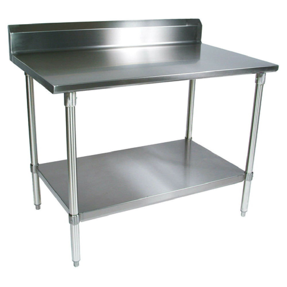 The BK Resources CVTR5-6030 Work Table is a versatile and sturdy solution for various professional environments, including commercial kitchens and industrial workshops. Featuring a 60"W x 30"D x 34-3/4"H overall size, this table's top is constructed from 16/304 stainless steel, providing exceptional durability and resistance to corrosion and impact. The addition of a 5"H riser enhances its practicality by preventing items from falling off the back, ensuring a tidy workspace. Reinforced with two 2" rectangular steel tubing, this work table offers increased stability and strength, accommodating heavy-duty tasks with ease. The table includes an adjustable stainless steel undershelf, allowing for tailored storage solutions to meet different operational needs. Supported by four 1-5/8" diameter stainless steel legs, the table ensures solid support and longevity, with adjustable stainless steel feet for leveling on uneven surfaces. This work table is NSF certified, highlighting its compliance with essential safety and sanitation standards. Whether utilized in high-demand food preparation environments or rigorous industrial settings, the BK Resources CVTR5-6030 Work Table stands out as a reliable and efficient component designed to enhance productivity and maintain organizational efficiency.