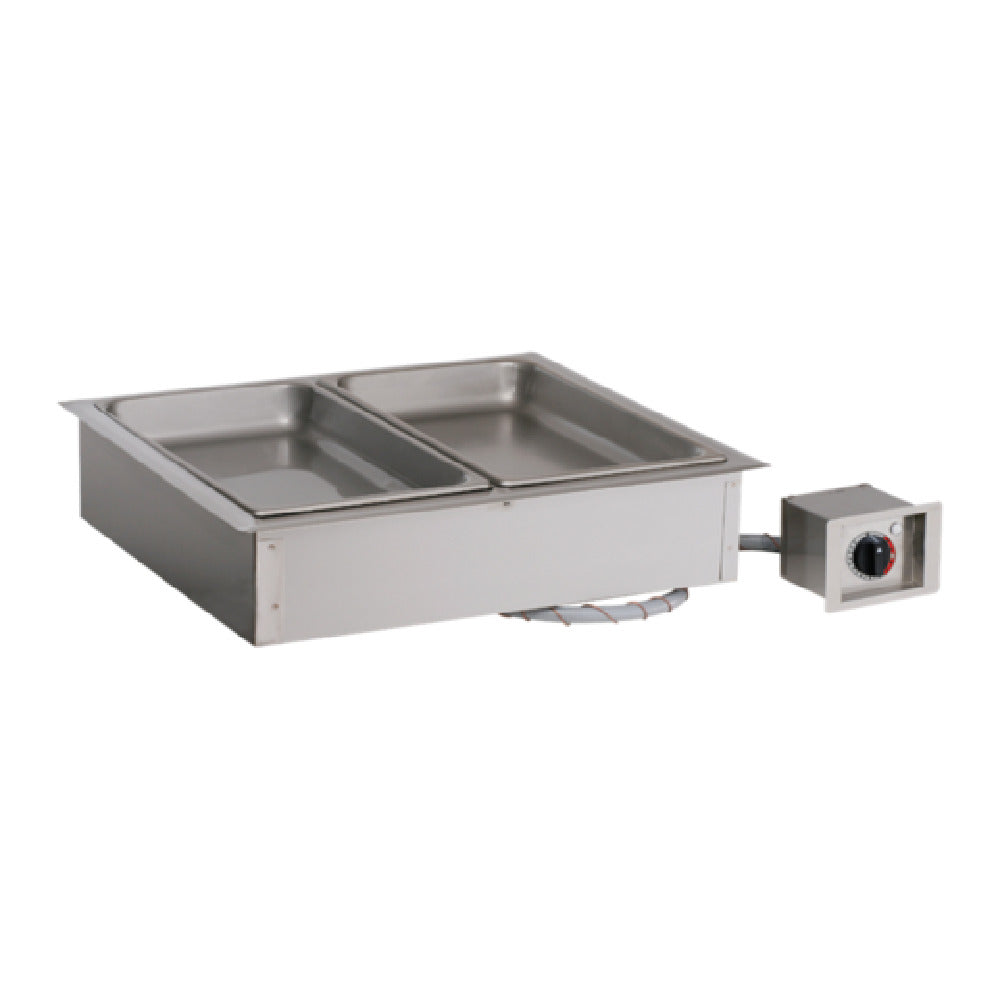 The BK Resources E-H21-4 Hot Food Well Unit Drop-In Electric Halo Heat® is an innovative solution designed for commercial kitchens seeking efficient and versatile food warming options. This electric hot food well unit is equipped with dual waterless compartments, providing a hassle-free operation that eliminates the need for water management. Each compartment is capable of accommodating either (2) GN 1/1 pans, (4) GN 1/2 pans, or (6) GN 1/3 pans, offering a flexible capacity to meet various culinary demands, with the ability to hold pans up to 4 inches deep. Included with the unit are (1) large pan divider bar and (4) half/third size divider bars, enabling precise customization of the interior space to suit different pan configurations. The E-H21-4 is certified by NSF and UL, ensuring compliance with rigorous safety and sanitation standards, while its IPX3 rating confirms protection against water splashes, making it a durable choice for busy food service environments. This drop-in unit is an exceptional fit for restaurants, catering services, and other food service establishments that require reliable, high-capacity food holding solutions, emphasizing ease of operation and maintenance with its advanced Halo Heat® technology.