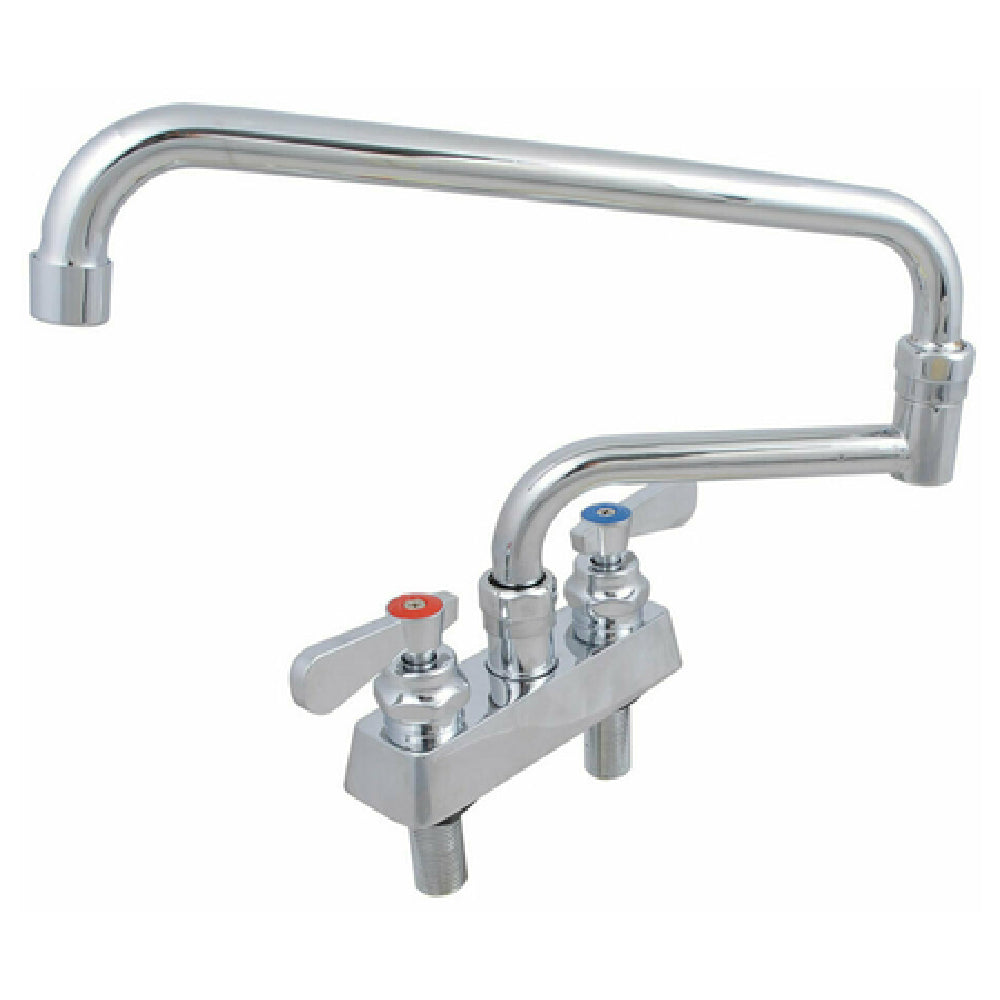 The BK Resources EVO-4DM-18 Evolution Faucet is a high-performance unit featuring a deck mount design with 4-inch centers, catering to the needs of various professional environments. It is equipped with an 18-inch double joint swing spout, providing flexibility and ease of use in different kitchen and industrial settings. The faucet incorporates quarter turn ceramic cartridges, ensuring smooth operation and longevity, while the integral check valve contributes to its efficient functionality. Constructed from T-304 cast stainless steel, this faucet guarantees durability and resistance to corrosion, making it suitable for demanding environments. The stainless steel cover further enhances its robust structure. In adherence to safety and health standards, the faucet is lead-free and certified by NSF, ensuring it meets stringent public health regulations. Additionally, it holds the cCSAus certification, verifying compliance with Canadian and American standards. The BK Resources EVO-4DM-18 Evolution Faucet is designed to deliver exceptional performance and reliability across various industry segments, including commercial kitchens, hospitals, and laboratories, where hygiene and efficiency are paramount.