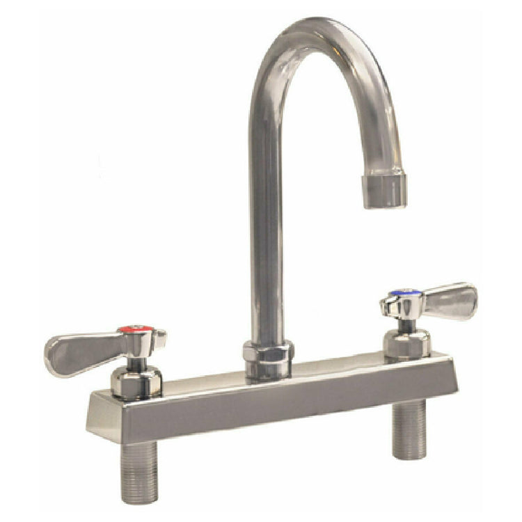 The BK Resources EVO-8DM-4G Evolution Faucet is a high-performance, deck-mounted fixture designed with precision to meet the diverse needs of various industries. Featuring an 8-inch center design, this faucet is engineered for optimal performance in commercial environments. The 4-1/2-inch gooseneck spout delivers a smooth and controlled water flow, essential for efficient operations in busy settings. The faucet is equipped with quarter-turn ceramic cartridges, which ensure durability and ease of maintenance. An integral check valve is included, providing a reliable safeguard against backflow, crucial for maintaining water safety standards. Crafted from T-304 cast stainless steel, the faucet boasts a robust and corrosion-resistant structure, ideal for long-term use in demanding atmospheres. The stainless steel cover enhances its durability and aesthetic appeal, ensuring it fits seamlessly into any professional setting. Being lead-free and NSF certified, the Evolution Faucet meets strict safety and quality standards, making it suitable for food service and healthcare applications. Additionally, it holds a cCSAus certification, reflecting its compliance with rigorous North American safety standards. The BK Resources EVO-8DM-4G Evolution Faucet is a versatile and reliable choice for industries requiring both functionality and compliance with health and safety regulations.