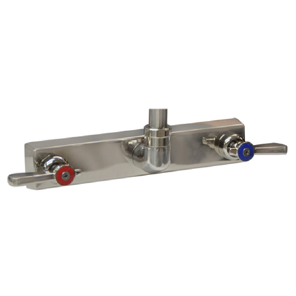 The BK Resources EVO-8SM-XX Evolution Faucet is a splash mount fixture designed with precision and durability, featuring 8-inch centers for robust installation capabilities. This model is engineered as a body only unit, providing customizable options for diverse industry requirements, with no spout included to allow for tailored applications. It incorporates quarter turn ceramic cartridges, ensuring smooth operation and longevity in high-usage environments. The integral check valve enhances its functionality by preventing backflow, a critical feature for maintaining water quality and safety. Constructed from T-304 cast stainless steel, this faucet assures exceptional resistance to corrosion and wear, accommodating demanding conditions. The stainless steel cover adds an extra layer of protection, further enhancing its resilience and aesthetic appeal. Significantly, it is lead-free, aligning with health and safety standards, making it suitable for food service and other safety-conscious applications. This faucet holds NSF certification, highlighting its compliance with key safety and sanitation standards, and cCSAus certification, verifying its adherence to Canadian codes and standards. The BK Resources EVO-8SM-XX Evolution Faucet stands out as a versatile and reliable choice across a variety of industry segments, from commercial kitchens to institutional facilities, thanks to its advanced features and robust construction.