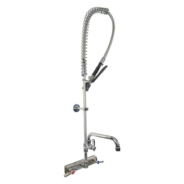 The BK Resources EVO-8SMPR-AF12 Evolution Pre-Rinse Assembly With Add-on Faucet Splash Mount is a highly efficient and versatile fixture designed for diverse industrial kitchens. This assembly features an 8" OC splash mount configuration, ensuring seamless integration into various setups. The add-on faucet boasts a 12" swing spout, providing extensive reach and flexibility for culinary tasks. A 12" wall bracket supports stability, ensuring longevity and consistent performance. The assembly is equipped with 1/4 turn ceramic cartridges, promoting durability and precise water flow control. Integral check valves are incorporated to prevent backflow, enhancing the system's safety and reliability. The dual pattern spray head, crafted from stainless steel, guarantees resilience and efficient operation under rigorous conditions. The stainless steel faucet base waterways further ensure robustness and long-lasting performance. Color-coded hot and cold indicators simplify usage, providing intuitive operation and minimizing user error. With 1/2" female inlets, this assembly offers compatibility with a wide range of plumbing configurations. The BK Resources EVO-8SMPR-AF12 is an exceptional choice for commercial kitchens that require durable and adaptable pre-rinse solutions, delivering superior functionality and convenience tailored to meet the demands of professionals in the food service industry.