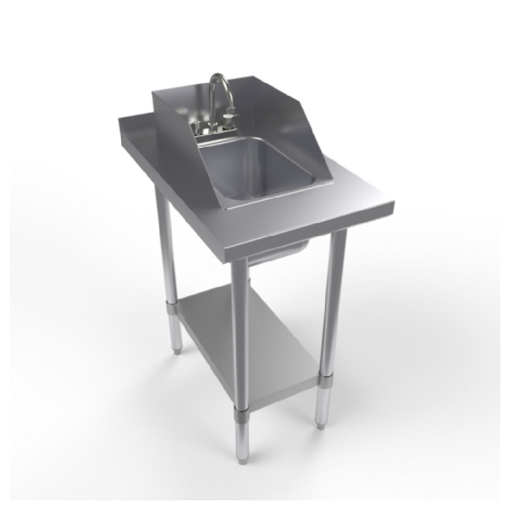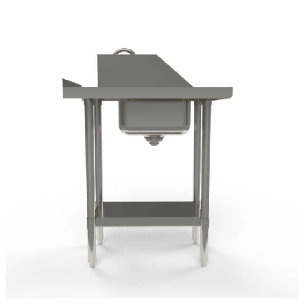 The BK Resources HST-1830-1014-SS Filler Table With Drop-in Sink is a versatile and robust addition to any commercial kitchen, designed to meet diverse industry needs. Featuring an 18-inch wide by 30-inch deep stainless steel top, made from durable 18/430 stainless steel, this filler table is built to withstand heavy use while maintaining a professional appearance. It also includes a convenient 1-1/2-inch riser at the rear, ensuring that any splashes or spills are effectively contained. The drop-in sink adds significant value, providing a seamless integration of workspace and washing area, ideal for tasks requiring frequent hand or utensil washing. The table's adjustable undershelf offers customizable storage solutions, maximizing space efficiency in compact environments. Supported by stainless steel legs, the table is equipped with adjustable high-impact corrosion-resistant feet, ensuring stability and longevity, even in the most demanding settings. Certified by NSF, this filler table meets stringent public health and safety standards, making it suitable for use in restaurants, food preparation areas, and other commercial settings where hygiene and durability are paramount. With a height of 41-3/4 inches, this table is designed with ease of use and accessibility in mind, catering to a wide range of professional kitchen environments.
