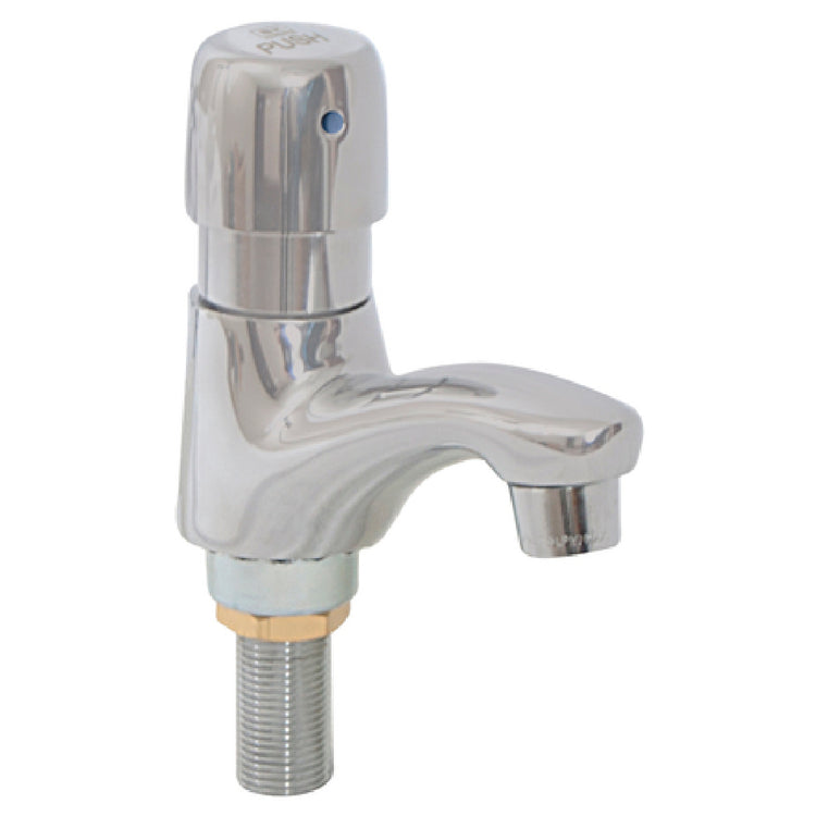 The BK Resources MF-1D-G Metering Faucet Deck Mount Single Supply is a finely engineered plumbing fixture tailored for precise water flow control in a variety of industry settings. This innovative faucet features an integral spout design and is equipped with an adjustable metering cartridge, allowing users to customize the flow duration according to their specific needs. With a 1/2-inch NPS connection shank, it ensures a secure and robust installation. Crafted from chrome-plated brass, this faucet is both durable and aesthetically pleasing, ensuring it will complement any professional environment. Notably, the faucet is lead-free, making it a safe choice for applications where water purity is paramount. The NSF certification highlights its compliance with strict health and safety standards, while its ADA compliance ensures accessibility for users with disabilities. This makes the BK Resources MF-1D-G an ideal choice for commercial kitchens, healthcare facilities, and other settings where safe and efficient water delivery is essential. Its unique combination of features and certifications underscores its value as a reliable and user-friendly solution for professionals seeking quality and compliance in their plumbing systems.