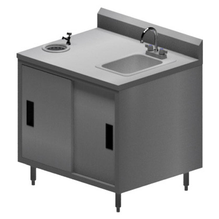 The BK Resources MOD-IC Work Table/Ice Cream Cabinet with Sliding Doors & 5" Riser Top is a versatile and durable solution designed for the foodservice industry, accommodating both preparation and storage needs. This unit features a 36"W x 30"D work surface, crafted from 14/304 stainless steel, ensuring longevity and resistance to corrosion. The body is constructed from 18/304 stainless steel, further enhancing its durability. Notably, the table includes a BK-DIS-1014-10-P-G drop-in sink with a pre-installed faucet and a BK-DWBA dipper well equipped with a BKF-DWE-G faucet, supporting efficient cleaning and hygiene practices. The cabinet's design incorporates two sliding doors, allowing for easy access to stored items and maximizing available workspace. With 6" stainless steel adjustable legs, this work table can be customized to the perfect height for various tasks, ensuring comfort and accessibility for users. The 5" riser top not only provides additional workspace but also serves as a backsplash, preventing spills and maintaining cleanliness. NSF certification attests to its compliance with rigorous public health and safety standards, making it a reliable choice for commercial kitchens, ice cream parlors, and other food preparation environments. Delivery is typically within a 3-10 day lead time, facilitating prompt integration into your operations.