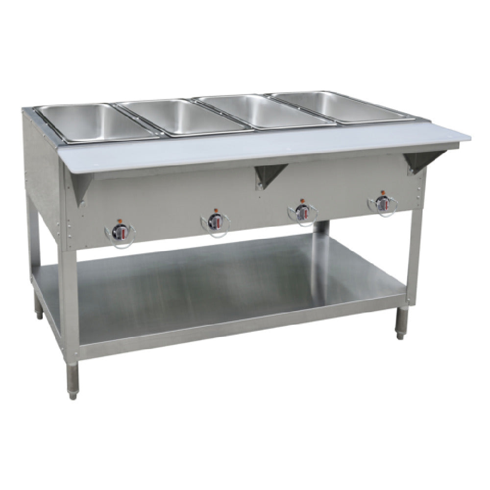 The BK Resources STE-LP-4 Hot Food Table LP Gas (4) Wells is a robust and efficient solution designed for professional kitchens and catering environments. This high-performance unit features four wells, each powered by an LP gas burner delivering 3,500 BTUs, ensuring consistent and powerful heating for various hot food items. Constructed from durable stainless steel, this hot food table promises longevity and resilience in demanding settings. Additionally, it includes a practical cutting board shelf, providing a convenient workspace for food preparation tasks. An adjustable undershelf further enhances its utility by offering customizable storage space, accommodating diverse kitchen needs. The combination of its sturdy build and essential features makes the BK Resources STE-LP-4 an excellent choice for food service operations seeking reliability and efficiency in hot food service. Its design caters to different market segments, from large-scale catering businesses to smaller, high-volume restaurants, ensuring hot food is maintained at the perfect temperature for service. This equipment is a testament to BK Resources' commitment to quality and functionality in commercial kitchen settings.