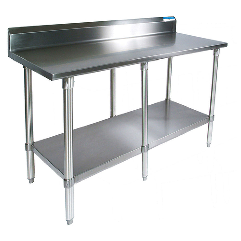 The BK Resources SVTR5-8430 Work Table is a highly durable and versatile work station, expertly crafted for various professional environments. Measuring 84 inches in width and 30 inches in depth, this table features an 18/430 stainless steel top, known for its robustness and corrosion resistance, making it ideal for demanding kitchen and industrial applications. The design includes turndown edges at the front and sides, ensuring safety and preventing spills. Reinforced with channels, it guarantees stability and support, essential for heavy-duty tasks. The 5-inch backsplash is a practical addition, protecting walls from splashes and debris. An adjustable stainless steel undershelf provides customizable storage options, enhancing utility and organization. The table is supported by six 1-5/8 inch diameter stainless steel legs, ensuring sturdy support. Completing the structure are stainless steel bullet feet, which provide stability and floor protection. This work table is NSF certified, ensuring it meets the highest standards for public health and safety. The BK Resources SVTR5-8430 Work Table serves as an invaluable asset to food service operations, laboratories, and workshops, offering exceptional durability, functionality, and compliance with industry standards.