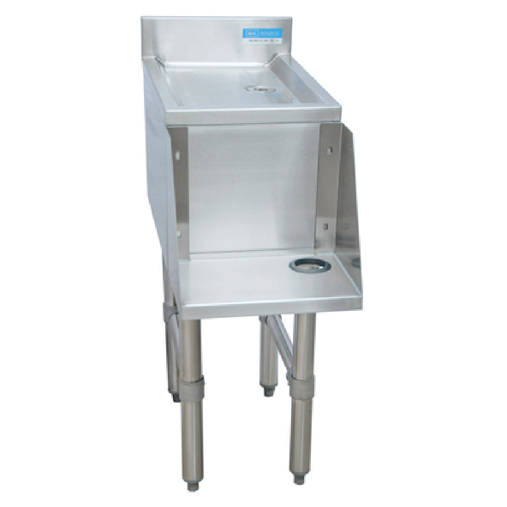 BK Resources UB4-18-BDMX12 Mixing Station is a compact and efficient solution designed for various food service applications, measuring 12"W x 18"D x 32-1/2"H. This mixing station is crafted from high-quality 18/304 stainless steel, ensuring durability and resistance to corrosion, making it suitable for high-demand environments. The stamped drainboard is an integrated feature that facilitates seamless liquid drainage, further enhanced by the included BKDR-15CP drain component. Additionally, this mixing station is equipped with an add-on blender station shelf, adding versatility and functionality to its design, catering to establishments in need of a dedicated space for blending tasks. The unit stands on stainless steel legs, which are not only robust but also feature adjustable, high-impact corrosion-resistant feet, providing stability and adaptability to different floor surfaces. This makes the BK Resources UB4-18-BDMX12 an ideal choice for diverse market segments within the food service industry, such as restaurants, cafes, and bars, where space efficiency and reliability are paramount. Its comprehensive design and durable build make it a valuable asset for professionals seeking a versatile and enduring mixing station.