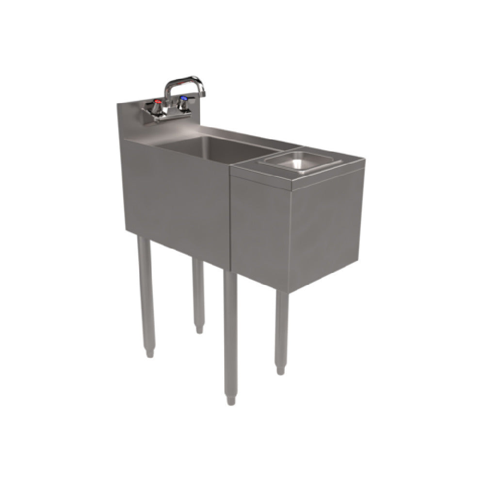 The BK Resources UB4-18-SS12-GR-PG Glass Rinser Hand Sink is a compact and efficient solution designed for diverse market segments requiring both handwashing and efficient glass rinsing capabilities. With overall dimensions of 12"W x 26-1/4"D x 33-1/2"H and a working height of 28-1/2"H, this unit is engineered to fit seamlessly into various commercial environments. The sink features a bowl measuring 10"W x 14"D x 6" deep, providing ample space for handwashing tasks. Enhanced with a splash mount lead-free faucet (model BKF-W2-6-G), it ensures compliance with safety standards. The integrated Push Down Glass Rinser, sized at 12"W x 8"D, offers a specialized cleaning solution for establishments that prioritize glassware maintenance. Constructed from durable 304 stainless steel, the unit is designed for longevity and resistance to corrosion. The stainless steel legs with adjustable corrosion-resistant bullet feet provide stability on diverse surfaces. As an NSF-certified product, it meets stringent health and safety regulations, making it ideal for restaurants, bars, and other service-oriented settings where hygiene and efficiency are paramount. This glass rinser hand sink is an exemplary blend of functionality and robust construction, tailored for businesses seeking reliable and compliant sanitation solutions.