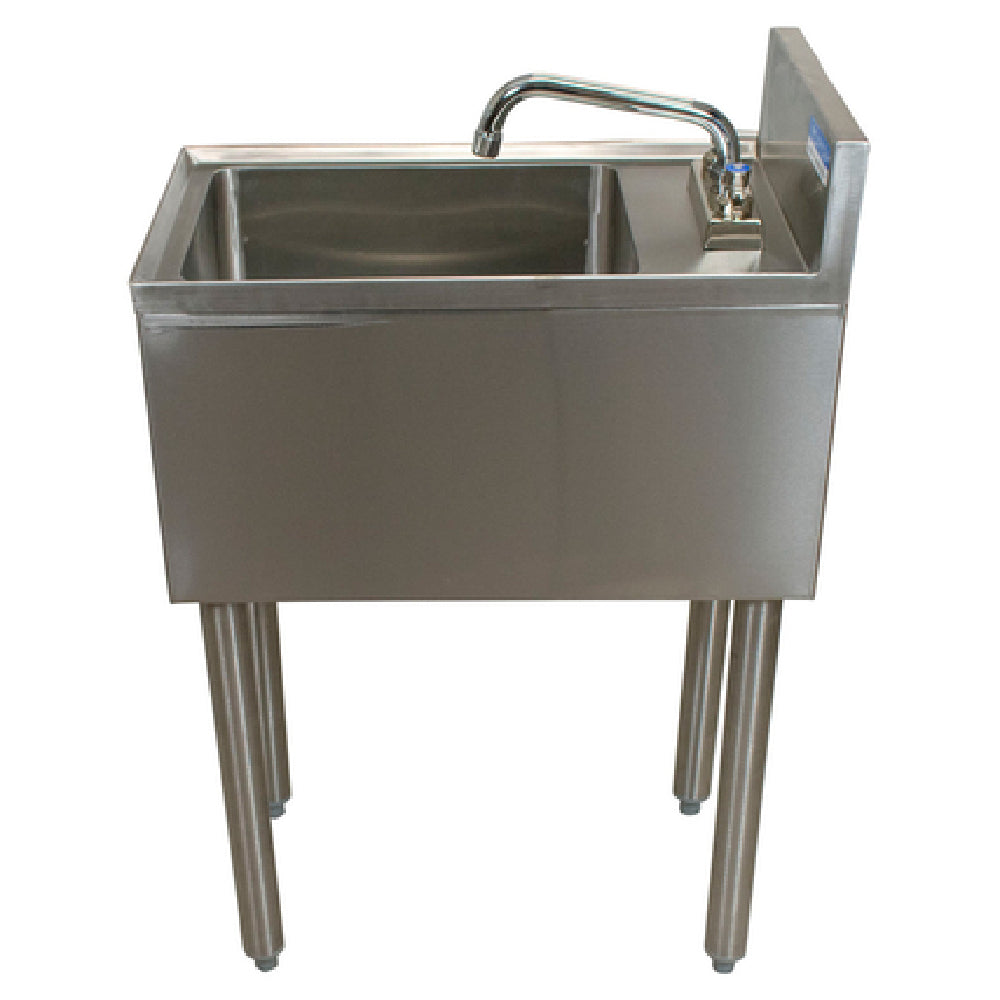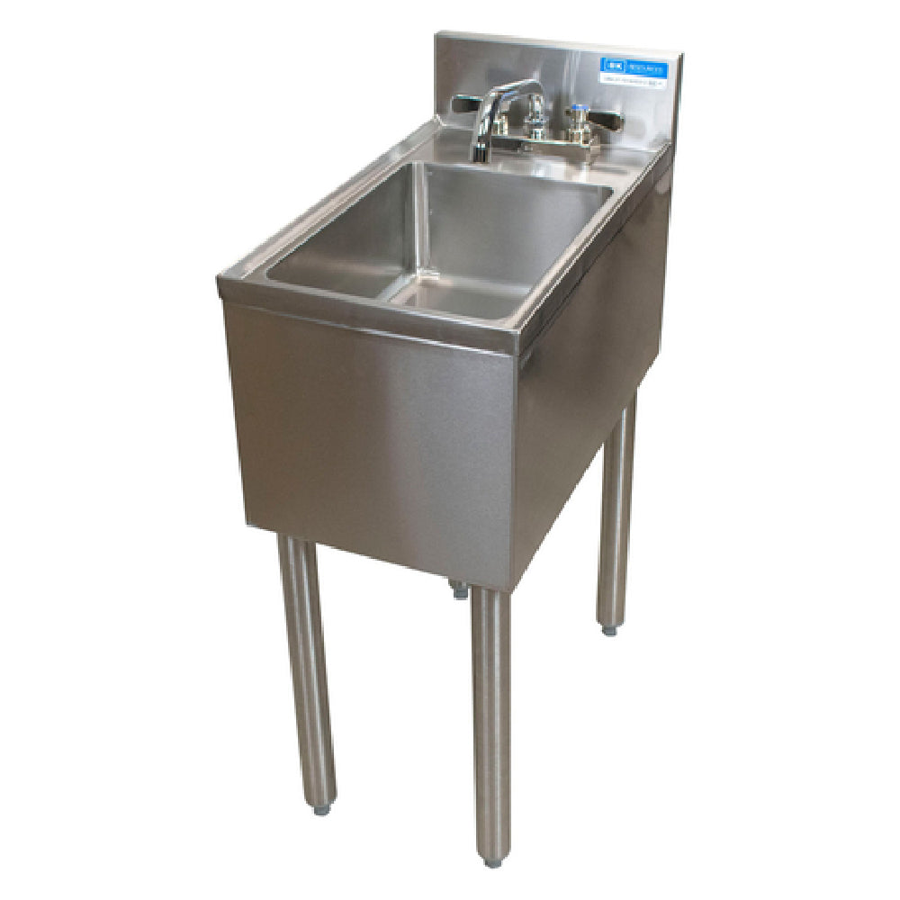 The BK Resources UB4-21-1014HSS-P-G underbar dump sink is a compact and efficient solution designed for commercial kitchen environments requiring reliable and space-conscious sanitation solutions. Its overall dimensions are 14-1/2 inches wide by 21-1/4 inches deep by 32-1/2 inches high, making it suitable for underbar installation where space is at a premium. The sink features a 10-inch wide by 14-inch front-to-back by 6-inch deep bowl, ensuring adequate capacity for various cleaning tasks. A 4-inch high backsplash helps to contain splashes and maintain a clean area. The included 4-inch OC deck mount lead-free faucet (BKD-6-G) exemplifies the commitment to safety and quality. Constructed from 18/304 stainless steel, both the top and the robust stainless steel legs and bracing are engineered for durability and longevity in demanding environments. The adjustable high-impact corrosion-resistant feet ensure stability and adaptability to various floor conditions. NSF certification underscores its compliance with rigorous public health and safety standards. The BK Resources UB4-21-1014HSS-P-G is a strategic choice for bars, restaurants, and cafes looking to optimize their workspace without compromising on quality and functionality.