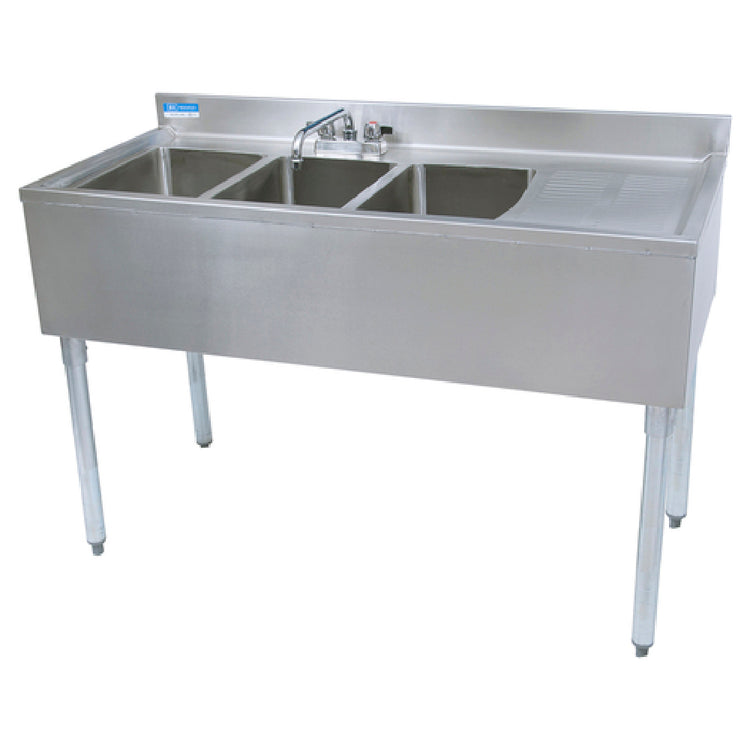 The BK Resources UB4-21-348RS Underbar Sink Three Compartment 48"W x 21-1/4"D x 32-1/2"H Overall Size is a meticulously engineered stainless steel underbar sink designed for high-efficiency environments in the food and beverage industry. It features three compartments, each measuring 10" wide x 14" front-to-back x 10" deep, providing ample space for a variety of cleaning tasks. This unit includes a 13-5/8" stamped drainboard on the right side, perfect for drying and organizing utensils. The 4-1/2" high backsplash helps maintain cleanliness by preventing water splashes, ensuring your workspace stays dry and sanitary. Equipped with a 4" OC deck mount lead-free faucet (BKD-10-G), this sink exemplifies a commitment to safety and environmental standards. The inclusion of basket drains (BKDR-2) and removable overflow standpipes (BK-OT-15075) enhances its functionality and versatility. Constructed from durable 18/304 stainless steel, this sink is built to withstand the rigors of daily use, with stainless steel legs and adjustable side bracing for added stability. The adjustable high impact corrosion resistant feet provide excellent support and adaptability to different floor surfaces. NSF certification confirms its adherence to strict public health and safety guidelines, making it an outstanding choice for bars, restaurants, and cafes.
