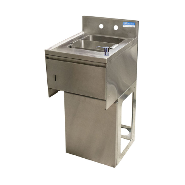 The BK Resources UBB-18-1012HST-15 Slimline Underbar Dump Sink is meticulously engineered to meet the diverse needs of the food service industry, with an overall size of 15-1/2" wide, 18-1/4" deep, and 33-1/2" high. It features a 12" front-to-back compartment, optimizing operational efficiency in compact spaces. The sink's design includes a 4" high backsplash, effectively preventing water spillage, and 4" OC splash mount faucet holes for convenient faucet installation. Crafted from 18/304 stainless steel, it assures robust durability and resistance to corrosion, crucial for maintaining sanitation standards. The package is inclusive of a strainer basket, soap dispenser (BK-UCSD-1), basket drain (BKDR-2), and towel dispenser, enhancing its functionality in high-demand environments. The pedestal base further supports the unit's stability, ensuring steady performance during rigorous use. This sink is NSF certified, reinforcing its compliance with stringent health and safety standards in professional settings. The BK Resources UBB-18-1012HST-15 is an indispensable fixture for bars, restaurants, and cafes seeking a compact yet efficient underbar solution, boasting reliable construction and essential accessories tailored to streamline operations in confined workspaces.