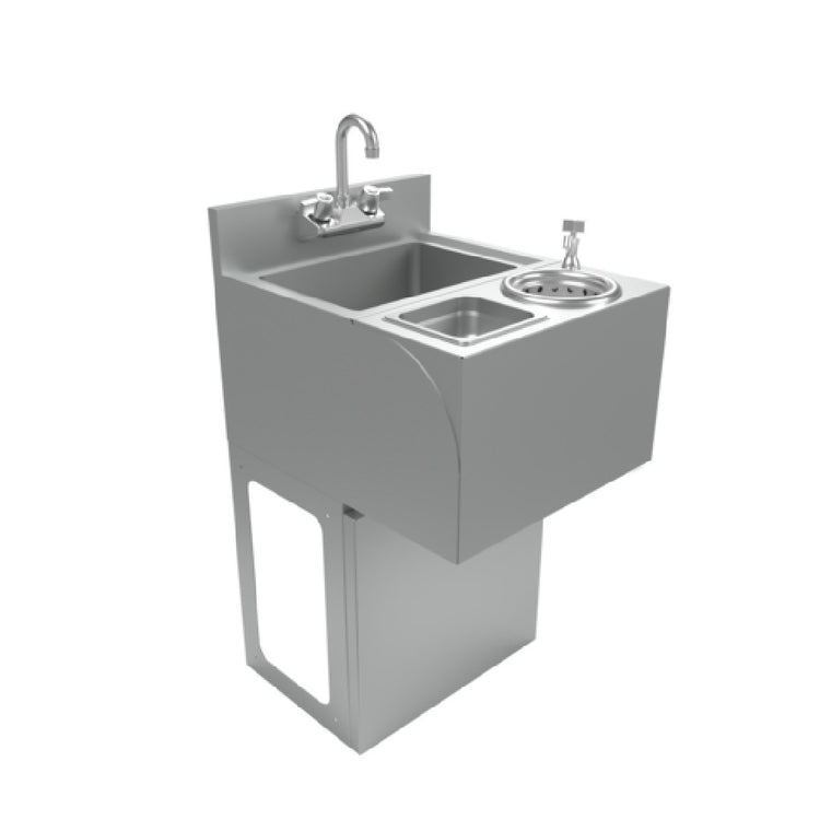The BK Resources UBB-21-SSP18-P-G Speed Station With Dump Sink is a meticulously designed piece of equipment that caters to multiple industry needs with precision and efficiency. This speed station measures 18 inches in width and 21-1/4 inches in depth, making it a compact yet functional unit suitable for fast-paced environments. Its sink bowl, measuring 14 inches wide, 10 inches front-to-back, and 6 inches deep, is equipped with a 1-1/2 inch drain, ensuring quick and effective water disposal. The unit features 4-inch on-center splash mount faucet holes, providing a seamless integration for faucet installation. The front panels, combined with a galvanized base, contribute to the unit's durability and stability. Additionally, the speed station’s adjustable plastic bullet feet allow for customizable height adjustments, enhancing its ergonomic functionality. Constructed from 18-gauge stainless steel, this product guarantees longevity and resistance to corrosion, making it ideal for environments where hygiene and durability are paramount. The BK Resources UBB-21-SSP18-P-G Speed Station with Dump Sink is a versatile asset for sectors such as hospitality, healthcare, and food service, delivering both practicality and reliability to professional settings where efficient space utilization is crucial.