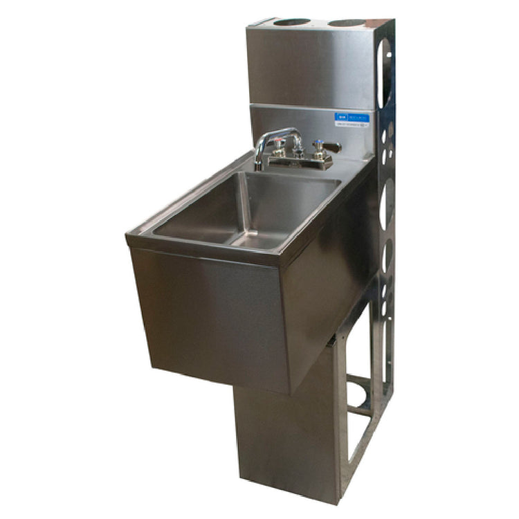 The BK Resources UBDW-21-1014HSS-P-G Underbar Dump Sink is a compact yet functional solution, measuring 14-1/2"W x 21-1/4"D x 33-1/2"H overall, specifically designed to fit efficiently in various underbar settings. The sink features a 10" wide x 14" front-to-back x 6" deep bowl, providing ample space for efficient waste handling in fast-paced environments. A 4"H backsplash is integrated to prevent water splashes on the surrounding surfaces, maintaining cleanliness and safety standards. This sink comes with a 4" OC deck mount lead-free faucet (BKD-6-G), ensuring compliance with health and safety regulations. Constructed from durable 18/304 stainless steel for the top, die wall, and base, this product guarantees longevity and resistance against corrosion. The BK Resources Underbar Dump Sink holds an NSF certification, signifying its adherence to public health and environmental requirements. This sink is ideal for bars, restaurants, and cafes that require a reliable underbar waste disposal solution, providing unparalleled value with its sturdy construction and thoughtful design. Its technical attributes make it a quintessential piece for enhancing operational efficiency in any food service establishment.