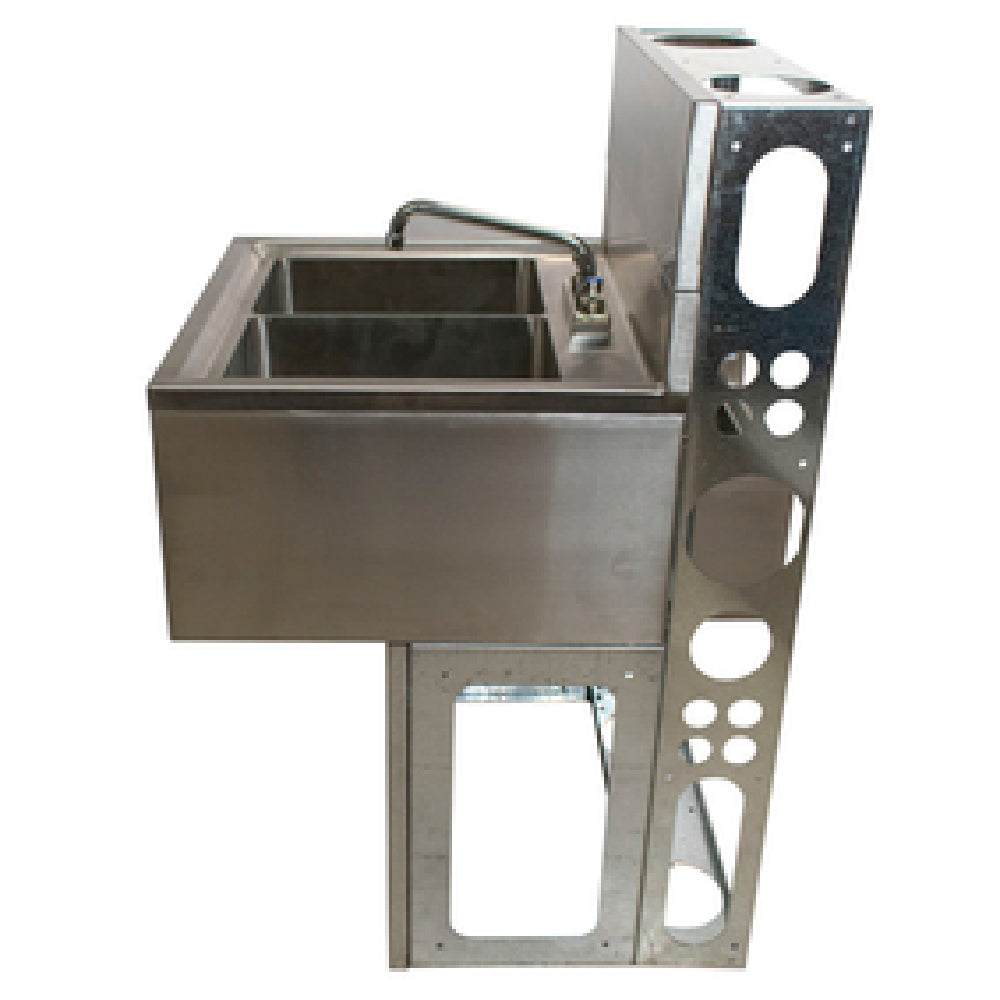 The BK Resources UBDW-21-248TS Underbar Sink is a versatile, two-compartment unit designed for efficiency and durability in commercial settings. With an overall size of 48"W x 21-1/4"D x 33-1/2"H, it is tailored to fit snugly under bars while maximizing functionality. Each compartment measures 10" wide x 14" front-to-back x 10" deep, providing ample space for various washing needs. Complementing the sink are two 13-3/16" stamped drainboards positioned on the left and right sides, facilitating convenient drainage and drying. The 4-1/2"H backsplash prevents water spillage, maintaining cleanliness in busy environments. Equipped with a 4" OC deck mount lead-free faucet (BKD-10-G), it ensures safe water flow. The inclusion of basket drains (BKDR-2) and removable overflow standpipes (BK-OT-15075) enhances utility and maintenance ease. Constructed from high-quality 18/304 stainless steel, the sink boasts a durable die wall and base, with a stainless steel apron on the front and sides for added robustness. Its compliance with NSF standards signifies its suitability for professional use, making it an ideal choice for bars, restaurants, and other commercial venues seeking reliable underbar solutions.