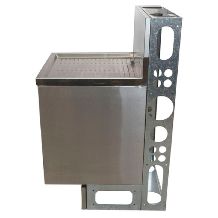 The BK Resources UBDW-21-GC240 Underbar Glass Rack Unit is a highly efficient and versatile addition to any bar or restaurant setup, tailored to meet the needs of industry professionals looking for quality and durability. Measuring 24"W x 21"D x 33-1/2"H, this unit is designed with an open front base for easy access and storage, accommodating a range of glassware sizes. The top of the unit is constructed from 18/304 stainless steel, providing a robust and hygienic surface that can withstand the demands of a busy service environment. The drainboard top is complemented by a 3" backsplash, effectively preventing spills and splashes, while the 1" NPS drain (BKDR-15CP) ensures efficient water management, making cleanup quick and simple. The die wall and base construction add to the unit's sturdiness, ensuring long-lasting performance. Certified by NSF, this underbar glass rack unit adheres to the highest standards of public health and safety, making it a reliable choice for any commercial establishment. Its compact size and practical features make it a versatile solution for bars, cafes, and restaurants, providing an organized and efficient workspace for staff without compromising on quality or functionality.