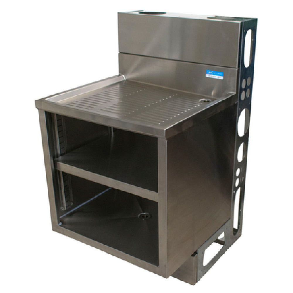 The BK Resources UBDW-21-GC241 Underbar Glass Rack Unit is a compact and efficient solution for bar and restaurant settings, designed to streamline glassware storage and drainage. With dimensions of 24"W x 21"D x 33-1/2"H, this unit is crafted to fit seamlessly into underbar spaces, maximizing utility without compromising on space. The unit features a drainboard top, constructed from high-quality 18/304 stainless steel, which ensures durability and resistance to corrosion in high-moisture environments. A 3" backsplash provides added protection against spills, while the integrated 1" NPS drain (BKDR-15CP) facilitates efficient water management, supporting cleanliness and hygiene. The open front base is designed for easy access, and the adjustable shelf allows for customizable storage solutions to accommodate different glassware sizes. The die wall and base add structural integrity, making this unit a reliable choice for high-traffic establishments. Certified by NSF, the BK Resources UBDW-21-GC241 meets rigorous public health and safety standards, affirming its suitability for use in demanding food service environments. Its thoughtful design and robust construction make it an invaluable asset for bars, restaurants, and hospitality venues aiming to optimize their operations and maintain high standards of cleanliness.