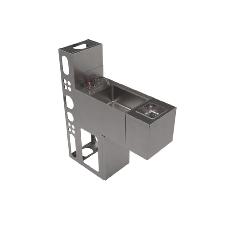 The BK Resources UBDW-21-SS12-GR-PG Glass Rinser Hand Sink is a versatile and compact unit measuring 12"W x 34-3/4"D x 34"H overall, with a functional working height of 28-1/2"H, making it an ideal option for bars, restaurants, and cafes with limited space. This hand sink features a bowl dimension of 10"W x 14"D x 6" deep, crafted from 18/304 stainless steel, ensuring durability and resistance to corrosion. It includes a splash mount lead-free faucet (BKF-W2-6-G) for safe and efficient operation, aligning with health standards. The inclusion of a Push Down Glass Rinser, sized at 12"W x 8"D overall, enhances its functionality by providing a quick and effective way to rinse glassware, which is crucial for maintaining cleanliness in busy service environments. The sink's design incorporates removable 18 gauge stainless steel front panels, coupled with a galvanized die wall and base, offering ease of maintenance and robust structural integrity. NSF certification attests to its compliance with public health standards, making it a reliable choice for food and beverage industries requiring stringent hygiene and operational efficiency. This product exemplifies a blend of practicality and quality construction, tailored to meet the diverse needs of the hospitality sector.
