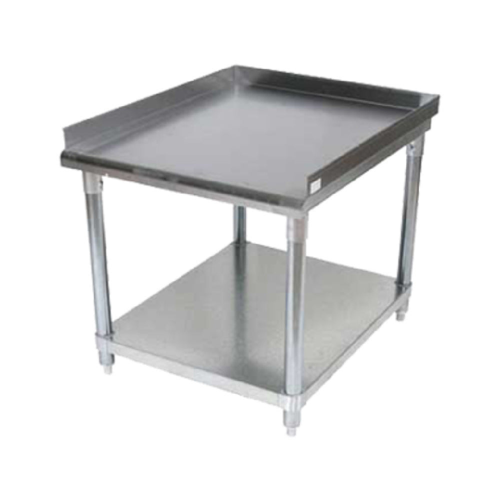 The BK Resources VETS-2430 Equipment Stand is a meticulously crafted support solution, measuring 25 inches in width, 30 inches in depth, and 26 inches in height, making it an ideal choice for various industrial applications. Its defining feature is the front rolled edge, which enhances both safety and durability. A 3-sided 2-inch riser with hemmed edges provides a secure perimeter, ensuring stability for equipment placement. The stand’s top is constructed from 18-gauge 430 stainless steel, renowned for its corrosion resistance and longevity, and is reinforced with 1-1/2 inch square tubing for added strength. Below the top, a galvanized undershelf offers additional storage, supported by sturdy 1-5/8 inch legs, which contribute to the stand's robust framework. Certified by NSF, this equipment stand meets stringent public health and safety standards, making it suitable for use in food service environments, commercial kitchens, and other professional settings. Its combination of durable materials and thoughtful design caters to the demanding needs of different market segments, including the food industry, hospitality sector, and manufacturing facilities, where reliable support and compliance with hygiene standards are paramount.