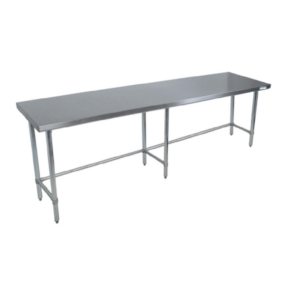 The BK Resources VTTOB-1884 Work Table is a versatile and durable solution for various professional environments, including commercial kitchens, laboratories, and workshops. This work table features an expansive 84-inch width and 18-inch depth, providing ample workspace for a variety of tasks. The table is constructed with a high-quality 18-gauge stainless steel top, specifically 18/304 stainless steel, which ensures resistance to corrosion and long-lasting performance even in demanding settings. The turndown edges on all sides add an extra layer of safety and prevent spills. Reinforced with channels, this table offers enhanced stability and strength. It boasts an open base with galvanized side and rear bracing, contributing to its sturdy construction. The table is supported by robust 1-5/8 inch diameter galvanized legs, further enhancing its durability. The adjustable high-impact corrosion-resistant feet allow for stability on uneven surfaces, making it adaptable to different working conditions. Designed to ship KD (knocked down), this work table is easy to assemble on-site. Certified by NSF, it meets stringent health and safety standards, making it an ideal choice for industries that require cleanliness and reliability. The BK Resources VTTOB-1884 Work Table combines size, quality materials, and engineering excellence to deliver unparalleled utility and value.