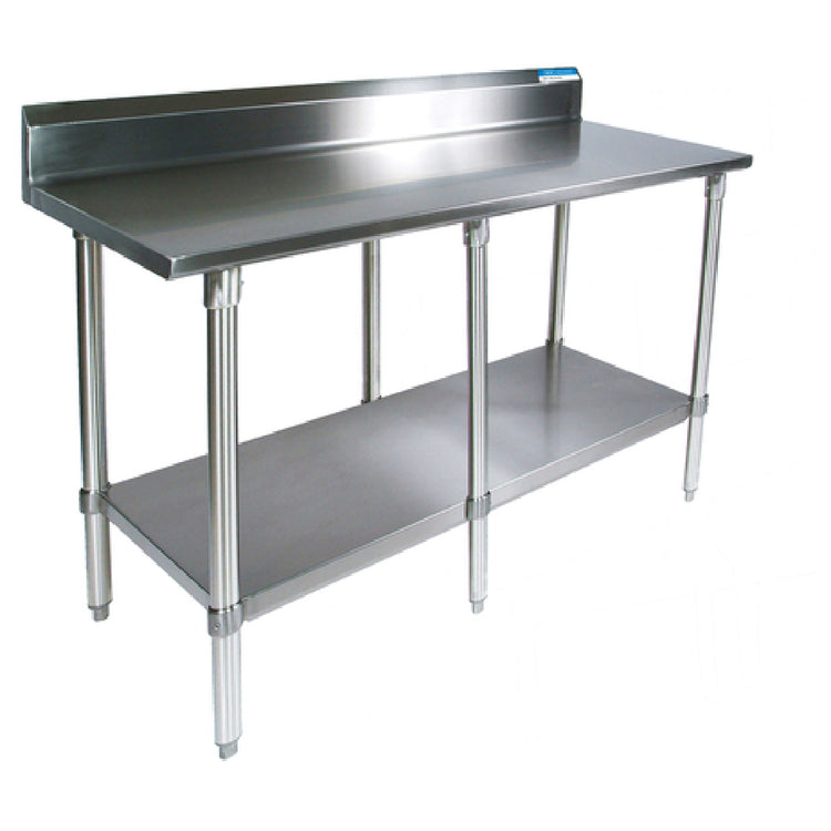 The BK Resources VTTR5-9630 Work Table is a robust and versatile option for industrial and commercial kitchens, measuring 96 inches in width and 30 inches in depth. This work table is constructed with an 18/430 stainless steel top, ensuring durability and resistance against corrosion, making it a reliable choice for rigorous kitchen environments. The table features turndown edges on the front and sides, enhancing safety and comfort during use. Reinforced with channels, it offers additional support and stability for heavy-duty tasks. A 5-inch backsplash is integrated into the design to protect walls from spills and splashes, maintaining cleanliness in the workspace. The adjustable galvanized undershelf provides flexible storage options, catering to dynamic kitchen needs. Supported by six 1-5/8-inch diameter galvanized legs, the table is built for sturdiness, while the adjustable high-impact corrosion-resistant feet ensure stability on uneven surfaces. Certified by the NSF, this work table adheres to high standards of public health and safety. This versatile table serves as an invaluable asset across various segments of the food service industry, from bustling restaurants to catering services, by combining durability with practical design features.