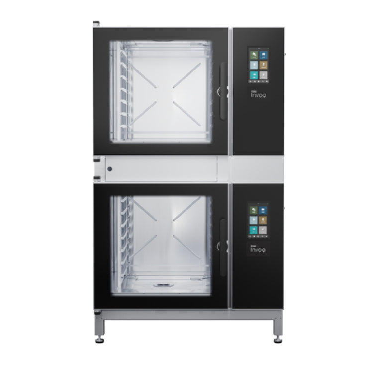 The Blodgett INVOQ 62BE/62BE Combi Oven Steamer is a highly advanced kitchen appliance designed for professional culinary operations. This electric combi oven steamer features a dual setup, with one 62BE unit stacked on top of the other, providing a substantial cooking capacity. Each unit can accommodate seven full-size 18" x 26" sheet pans or 28 hotel pans measuring 12" x 20", making it ideal for high-volume food production. The oven is equipped with touch screen controls and offers multiple cooking modes, including SmartChef, MenuPlanner, and CombiSpeed/CombiSense, allowing for the storage of up to 1,500 recipes. It also includes a built-in hand shower and a HybridSteam system that combines injection and boiler steam technologies. An external temperature probe, Delta-T cooking, and the Cook & Hold function enhance precision in culinary techniques. The oven features a USB port and optional Cloud Connectivity, supporting modern kitchen management needs. Safety and maintenance are addressed with a triple-pane glass door and the CareCycle Tablet-based automatic cleaning system. Constructed with a stainless steel exterior and interior, this ENERGY STAR® certified appliance meets cULus, NSF, and CE standards, highlighting its efficiency and compliance with industry regulations.