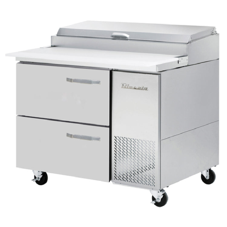 The Blue Air BAPP44-D2-HC Pizza Prep Table - a one-section unit measuring 44-3/8" wide - is designed for efficiency and performance in busy kitchen environments. It boasts an 11.3 cubic feet capacity and features side-mounted, self-contained refrigeration, ensuring consistent cooling. The table includes two drawers, which can accommodate up to six 1/3 size pans. An insulated pan cover with a stainless steel divider helps maintain optimal temperatures within a range of 33°F to 39°F. For added convenience, the unit comes with a 19" deep cutting board and is constructed with durable stainless steel both inside and out. The pizza prep table is equipped with 4" high swivel casters, of which two are braked for stability. Utilizing R290 Hydrocarbon refrigerant, this table operates with a 3/8 HP compressor at 115 volts, 60 hertz, and single-phase power, drawing 3.5 amps. It includes a cord with a NEMA 5-15P plug. Certified by cUL, UL, and ETL-Sanitation, the Blue Air BAPP44-D2-HC is an ideal choice for pizzerias and commercial kitchens that require a reliable and efficient food preparation surface with integrated refrigeration.