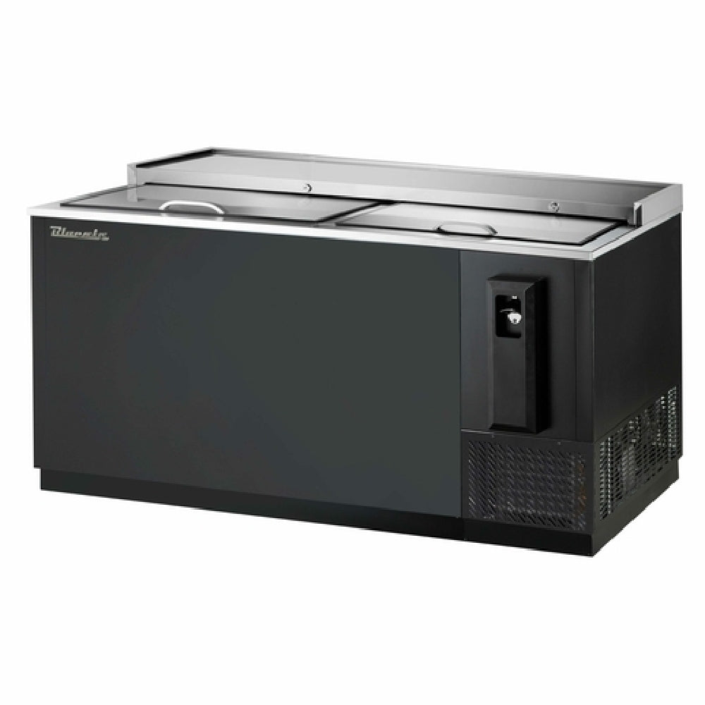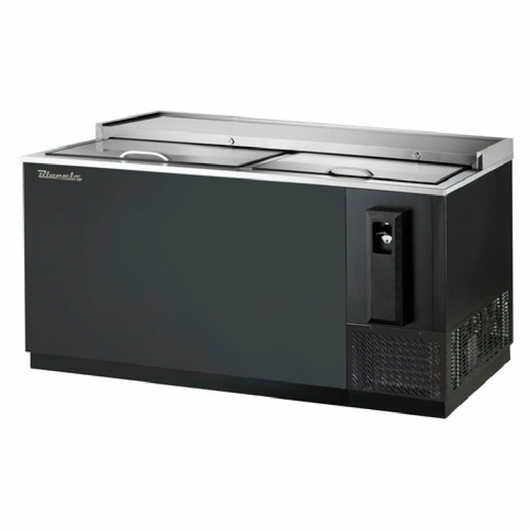 The Blue Air BBC-65B-HC Bottle Cooler - 64-1/2"W is a robust and efficient cooling solution designed for commercial use, featuring a side-mounted self-contained refrigeration system. With a spacious 20.1 cubic foot capacity, it is well-suited for bars, restaurants, and beverage service environments requiring reliable and ample bottle storage. The unit boasts a durable stainless steel top and a sleek black vinyl-coated steel exterior, providing both aesthetic appeal and durability. This bottle cooler comes equipped with two locking sliding lids, ensuring security and easy access, along with three dividers for organized storage. It includes a removable cap catcher with a built-in bottle opener for added convenience. The interior is crafted from galvanized material with a stainless steel floor, enhancing its resilience and ease of cleaning. Utilizing R290 Hydrocarbon refrigerant, the cooler is environmentally friendly and energy-efficient. It operates on a 3/8 horsepower motor, with a 115v/60Hz/1-phase electrical requirement, drawing 3.5 amps, and comes with a NEMA 5-15P plug. The automatic defrost feature reduces maintenance efforts, while its UL, cUL, and ETL-Sanitation certifications underscore its compliance with safety and sanitation standards. This bottle cooler merges performance with practicality, meeting various market segment needs effectively.