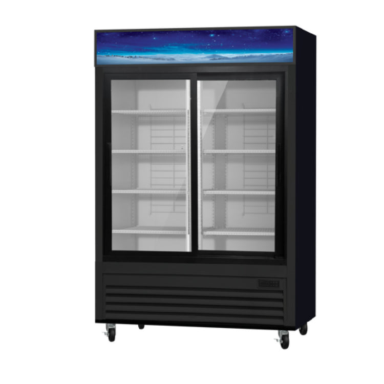 Blue Air FSE LLC, BGM47SLB-HC, Refrigerated Merchandiser, two-section, 41 cu. ft. capacity, bottom-mount self-contained refrigeration, (2) double pane sliding glass doors, (8) adjustable epoxy coated wire shelves, LED interior lighting, backlit graphic panel, digital monitoring system, black painted steel exterior and trim, white painted steel interior, (4) 4" swivel casters (2 braked), R290 Hydrocarbon refrigerant, 1/2 HP, 115v/60/1-ph, 7 amps, cord, NEMA 5-15P, cULus, ETL-Sanitation