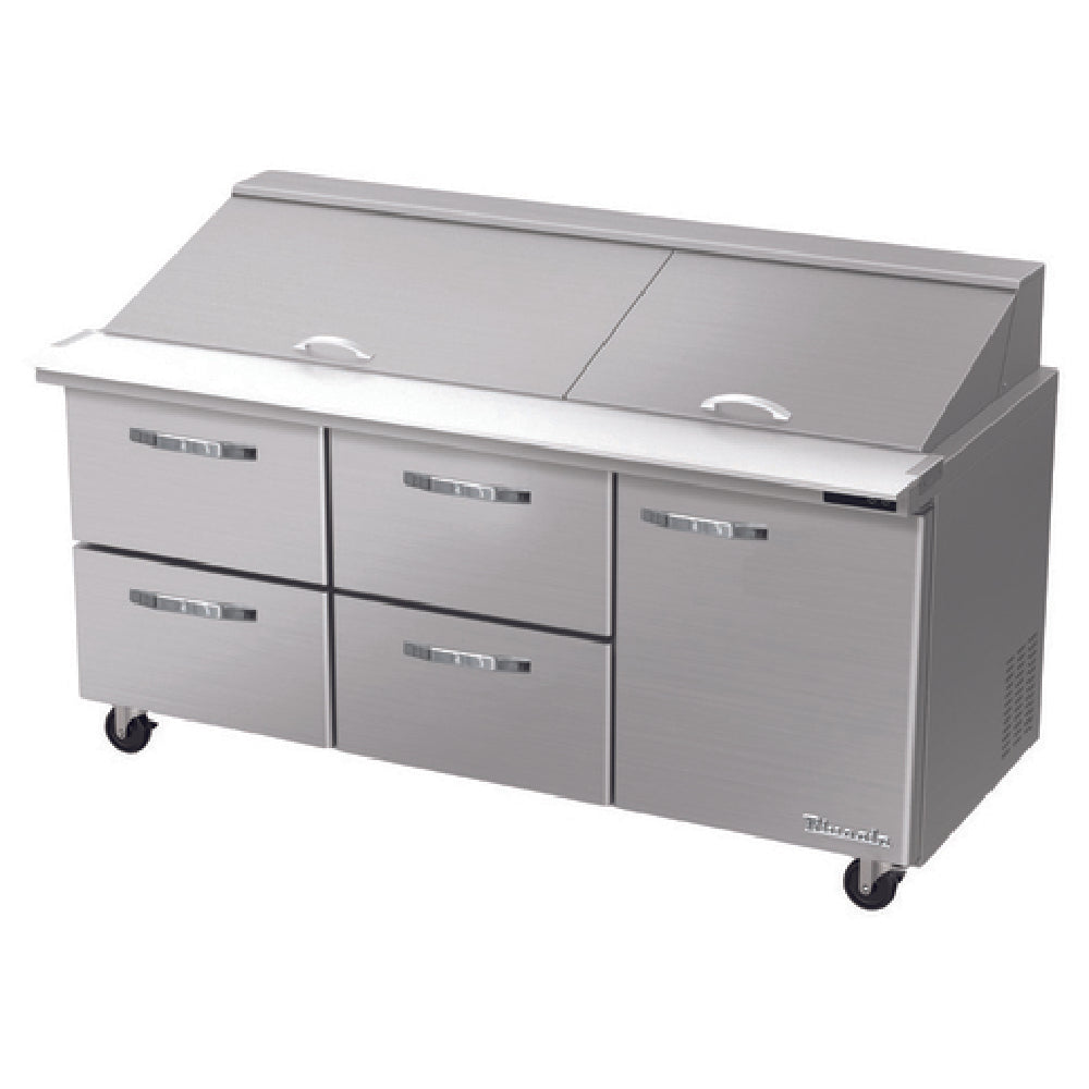The Blue Air BLMT72-D4LM-HC Mega Top Sandwich Prep Table is a high-performance refrigeration unit designed for the demanding environments of commercial kitchens. With a spacious three-section design measuring 72-3/8"W, this unit offers a substantial 20.2 cu. ft. capacity, making it an ideal choice for establishments with high-volume sandwich and salad preparation needs. It accommodates up to 30 1/6 size pans, neatly organized under an insulated pan cover with a stainless steel divider, ensuring ingredients remain fresh within a temperature range of 33°F to 39°F. The prep table is equipped with four drawers and one self-closing swing door on the right, providing flexible storage options. The inclusion of a 9-1/2" cutting board and side rail cutting board bracket enhances its functionality for quick and efficient food preparation. Featuring a rear-mounted self-contained refrigeration system using the eco-friendly R290 Hydrocarbon refrigerant, this unit is both efficient and environmentally conscious. The table's durability is underscored by its stainless steel interior and exterior, complemented by four 4" swivel casters, two of which are braked for stability. The self-diagnostic digital controls and monitor system streamline operation and maintenance, making the Blue Air BLMT72-D4LM-HC a valuable asset in any commercial food service setting.
