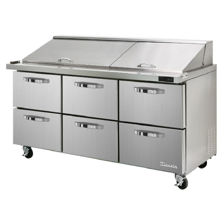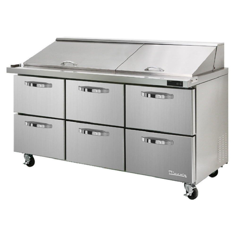 The Blue Air BLMT72-D6-HC Mega Top Sandwich Prep Table is a versatile three-section unit with a width of 72-3/8 inches, designed to meet the rigorous demands of commercial kitchens. It boasts a substantial 20.2 cubic feet capacity, accommodating up to thirty 1/6 size pans, which are included. The prep table features six convenient drawers, enhancing its organizational capabilities. A 9-1/2 inch cutting board, complete with a side rail cutting board bracket, provides ample space for food preparation. The table maintains a temperature range of 33°F to 39°F, ensuring ingredients remain fresh. With its rear-mounted self-contained refrigeration system utilizing R290 Hydrocarbon refrigerant, it ensures efficient cooling. The self-diagnostic digital controls and monitor system provide ease of operation. Constructed with robust stainless steel both inside and out, it promises durability and easy maintenance. Mobility is facilitated by four 4-inch swivel casters, two of which are braked. Its 1/4 HP motor operates on 115 volts, drawing 5.5 amps, and it is equipped with a cord with NEMA 5-15P plug. The Blue Air BLMT72-D6-HC is cETLus and ETL-Sanitation certified, making it an excellent choice for food service establishments seeking reliability and efficiency in their sandwich preparation processes.