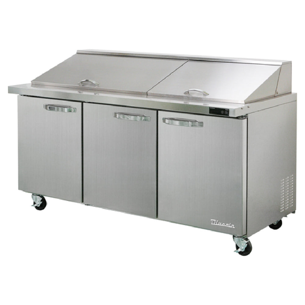 The Blue Air BLMT72-HC Mega Top Sandwich Prep Table is a versatile and high-capacity solution for food service operations that require efficient preparation and storage capabilities. This three-section unit spans 72-3/8 inches wide and offers a substantial 20.2 cubic feet of internal capacity. It features rear-mounted, self-contained refrigeration, maintaining a consistent temperature range of 33°F to 39°F. The table accommodates up to 30 1/6 size pans, making it ideal for diverse ingredient organization. Equipped with three self-closing swing doors and three adjustable wire shelves, it provides convenient access and customizable storage options. The 9-1/2 inch cutting board, supported by a side rail cutting board bracket, facilitates seamless food preparation. An insulated pan cover with a stainless steel divider ensures temperature integrity for stored ingredients. Constructed with durable stainless steel both inside and out, the unit promises lasting durability. Mobility is enhanced by four 4-inch swivel casters, two of which are braked for stability. Utilizing R290 Hydrocarbon refrigerant, this prep table is eco-friendly and energy-efficient, powered by a 1/4 HP motor. With a 115v/60/1-ph electrical requirement and a NEMA 5-15P plug, it combines functionality with compliance, carrying cETLus and ETL-Sanitation certifications.