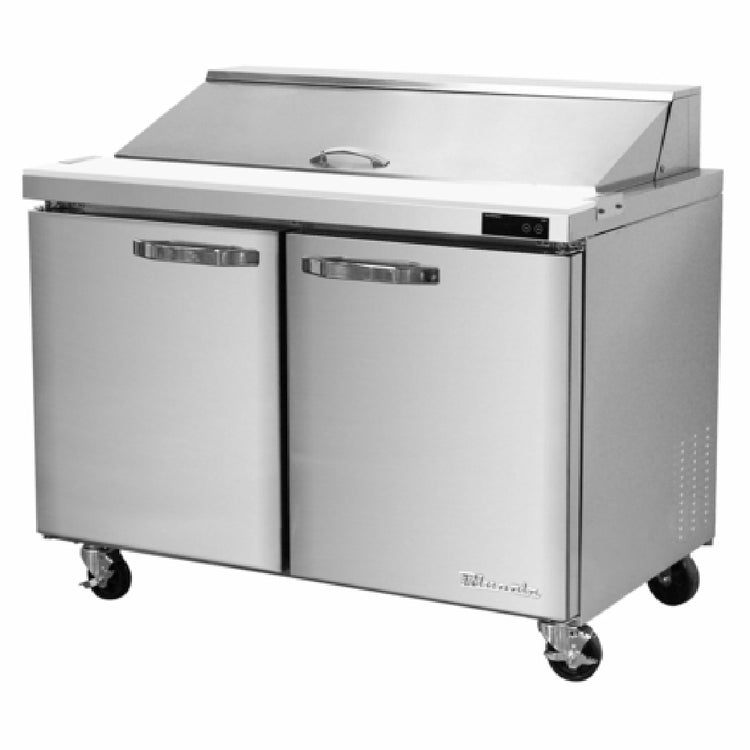 The Blue Air BLPT36-HC Sandwich Prep Table is a two-section unit measuring 36-3/8 inches in width, engineered for efficient and reliable performance in food service environments. With a 9.5 cubic feet capacity, it provides ample storage, accommodating ten 1/6 size pans, which are included with the unit. The table features two self-closing swing doors and two adjustable wire shelves, enhancing accessibility and versatility. Its 9-1/2 inch cutting board is supported by a side rail bracket, offering a functional workspace for food preparation. The rear-mounted, self-contained refrigeration system maintains a temperature range of 33-39°F, ensuring optimal freshness for ingredients. An insulated pan cover with a stainless steel divider provides added protection, while digital controls facilitate precise temperature management. Constructed with a stainless steel interior and exterior, the table is both durable and easy to clean. Mobility is enhanced by four 4-inch swivel casters, two of which are braked for stability. The unit utilizes R290 Hydrocarbon refrigerant, powered by a 1/4 HP motor, and runs on a 115v/60/1-ph electrical system drawing 4.1 amps, complete with a NEMA 5-15P plug. Fully certified by cETLus and ETL-Sanitation, the BLPT36-HC is designed for professional kitchen environments that prioritize efficiency and reliability.