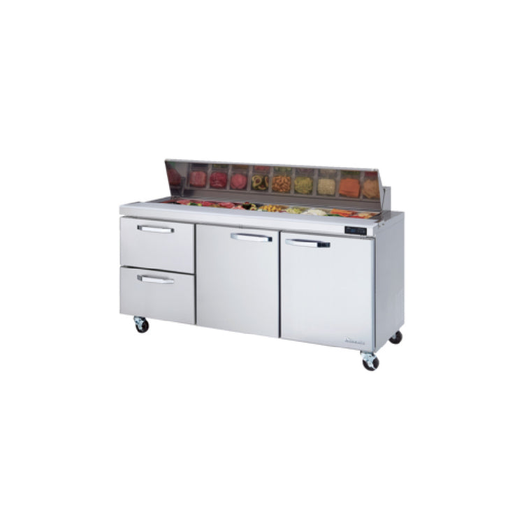 Blue Air FSE LLC, BLPT72-D2L-HC, Sandwich Prep Table, three-section, 72-3/8"W, 20.2 cu. ft. capacity, rear-mounted self-contained refrigeration, (18) 1/6 size pan capacity (included), (2) drawers, (2) self-closing swing door (in middle and right), (2) adjustable wire shelf, 9-1/2" cutting board, side rail cutting board bracket, 33° F to 39° F temperature range, insulated pan cover with stainless steel divider, self-diagnostic digital controls & monitor system, stainless steel interior, stainless steel exterior (galvanized steel back & bottom), (4) 4" swivel casters (2 braked), R290 Hydrocarbon refrigerant, 1/4 HP, 115v/60/1-ph, 5.3 amps, cord with NEMA 5-15P, cETLus, ETL-Sanitation