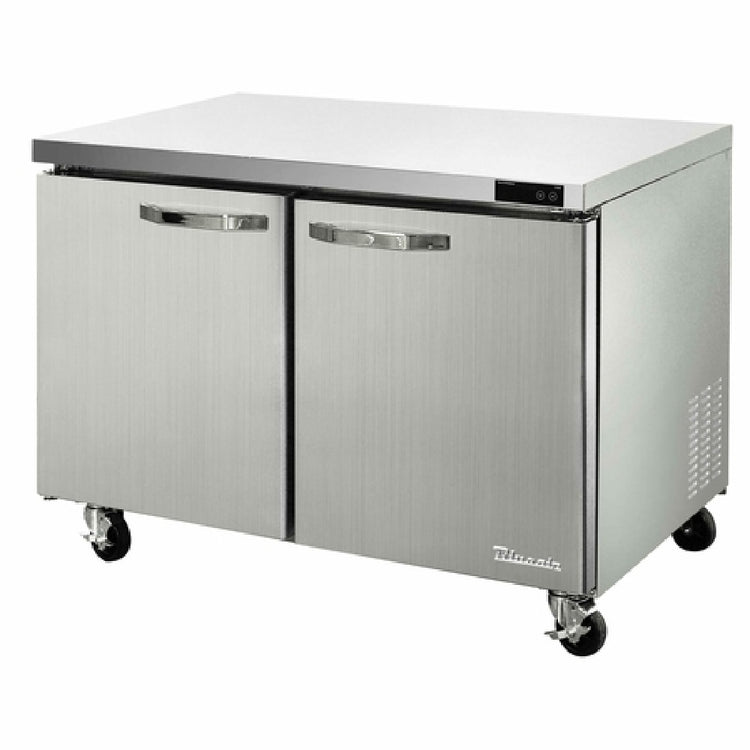 The Blue Air BLUF60-HC Undercounter Freezer Two-section 60-3/8"W is a highly efficient freezing solution designed for commercial environments, boasting a substantial 16.7 cu. ft. capacity. This model features rear-mounted self-contained refrigeration, capable of maintaining temperatures between -10°F to 0°F, ensuring optimal storage conditions for a variety of perishables. The unit is equipped with two self-closing swing doors and metal door handles, enhancing convenience and energy efficiency. An open door alarm provides an added layer of functionality by alerting users when the doors are not securely closed. The freezer includes four adjustable wire shelves, allowing for customizable storage configurations, and employs a self-diagnostic digital temperature control and monitor system for precise temperature management. Its robust stainless steel interior and exterior ensure durability and ease of cleaning, while four 4" swivel casters, two of which are braked, facilitate mobility and stability. Utilizing eco-friendly R290 refrigerant and powered by a 1/2 HP motor, this freezer operates efficiently on a 115v/60/1-ph electrical system drawing 6.2 amps. It comes with a cord and NEMA 5-15P plug, and holds cETLus and ETL-Sanitation certifications, making it a reliable choice for restaurants, cafes, and other food service establishments seeking dependable undercounter freezing solutions.