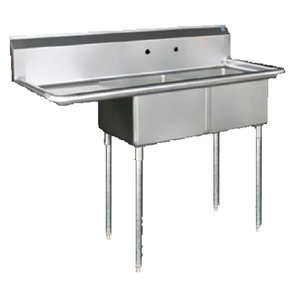 The Blue Air BS2-18-12/L Sink 2-compartments 18" Left Drainboard is a versatile and durable fixture designed for professional kitchens and food service environments. It features two spacious 18" front-to-back x 18" wide x 12" deep bowls, providing ample space for washing and rinsing tasks. Crafted from high-quality 18/304 stainless steel, this sink ensures longevity and resistance to corrosion, making it ideal for rigorous daily use. The accompanying 18" left drainboard enhances functionality by creating additional workspace for drying or organizing kitchenware. Supported by sturdy stainless steel legs with adjustable feet, the sink maintains stability on uneven surfaces and accommodates diverse kitchen layouts. Its NSF certification underscores its compliance with public health standards, making it a reliable choice for maintaining hygiene. The Blue Air BS2-18-12/L Sink is particularly beneficial for restaurants, catering businesses, and institutional kitchens that require efficient and reliable cleaning stations. With its practical design and robust construction, this sink stands out as a valuable asset for any commercial kitchen seeking to enhance its operational efficiency and maintain high standards of cleanliness.