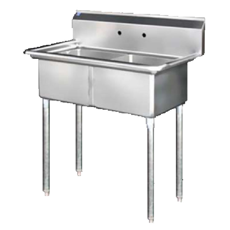 The Blue Air BS2-18-12/N Sink is an expertly engineered 2-compartment unit designed without a drainboard, offering versatility and efficiency for various commercial kitchen environments. Each compartment boasts dimensions of 18 inches front-to-back by 18 inches wide and 12 inches deep, crafted to accommodate diverse washing and rinsing tasks. Constructed from 18/304 stainless steel, this sink exemplifies durability and resistance to corrosion, ensuring long-lasting performance in demanding settings. The robust stainless steel legs are equipped with adjustable feet, allowing for stability on uneven surfaces and providing flexibility in installation. Certified by NSF, this sink meets stringent public health and safety standards, making it an ideal choice for professional kitchens that prioritize hygiene and reliability. The Blue Air BS2-18-12/N Sink’s compact yet functional design makes it suitable for a range of industries, from food service operations to hospitality settings, where efficient use of space and robust performance are paramount. Its thoughtful construction and compliance with industry standards highlight its unique value proposition, positioning it as a reliable asset for businesses seeking quality and dependability in their kitchen equipment.
