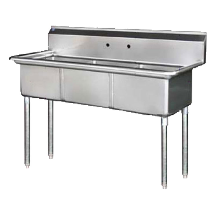 The Blue Air BS3-24-14/N Sink-3-compartments-no-drainboard is a versatile and essential addition to any commercial kitchen environment, providing robust and reliable functionality without unnecessary embellishments. Designed with three compartments, each measuring 24 inches front-to-back, 24 inches wide, and 14 inches deep, this sink model offers ample space for washing, rinsing, and sanitizing tasks in a streamlined manner. Constructed from high-quality 18/304 stainless steel, the sink promises durability and resistance to corrosion, ensuring a long-lasting and hygienic workspace. Its stainless steel legs, coupled with adjustable feet, provide stability on any surface, allowing for easy leveling to accommodate floor irregularities. The absence of a drainboard emphasizes its utility in confined spaces or situations where efficient use of area is paramount. Certified by the NSF, this sink meets strict public health standards, making it suitable for various commercial settings such as restaurants, cafeterias, and catering services. By focusing on essential features and quality materials, the Blue Air BS3-24-14/N Sink provides a practical solution for diverse market segments within the food service industry, accommodating varying needs while maintaining a high standard of cleanliness and efficiency.